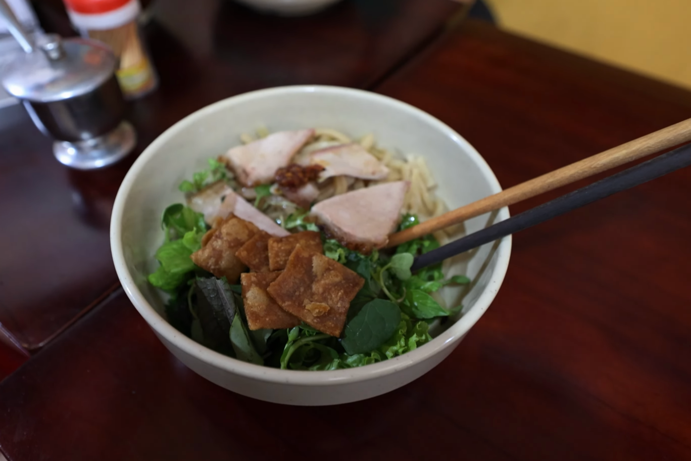 Nhân viên của quán trụng sợi mì qua nước sôi, sắp xếp vào bát cùng giá đỗ chần, rau sống, rồi xếp những lát thịt xá xíu mềm mại lên trên. Cuối cùng, vài miếng tóp mỡ giòn rụm được thêm vào và rưới lên một lớp nước xốt đậm đà. "Trông bát cao lầu ngon lành và thơm phức", Shayna thốt lên.