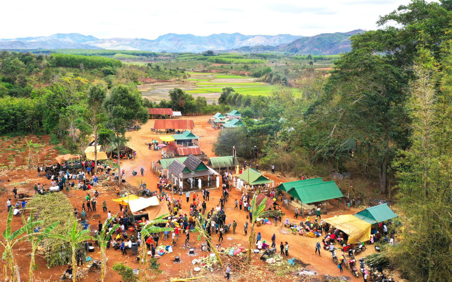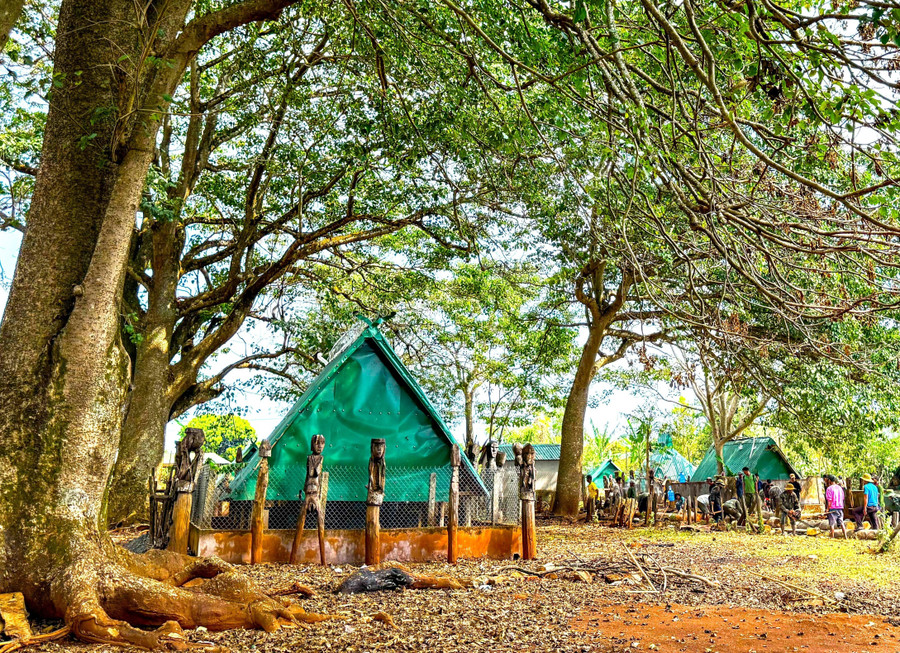Toàn cảnh khu nhà mồ của người Jrai nhìn từ trên cao trong lễ pơ thi - nghi lễ lớn của cộng đồng thường diễn ra vào tháng 3. Ảnh: Bi Ly
