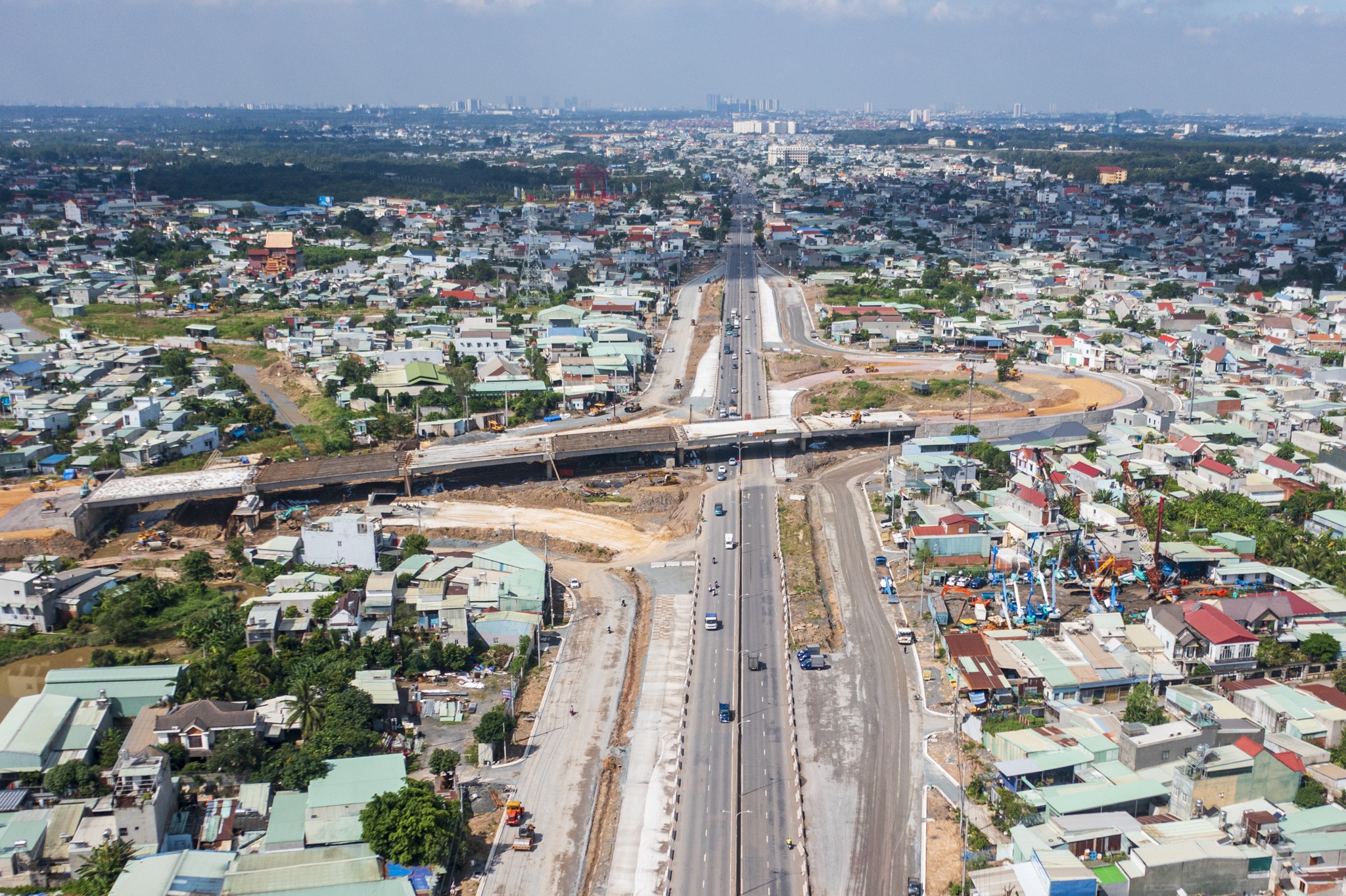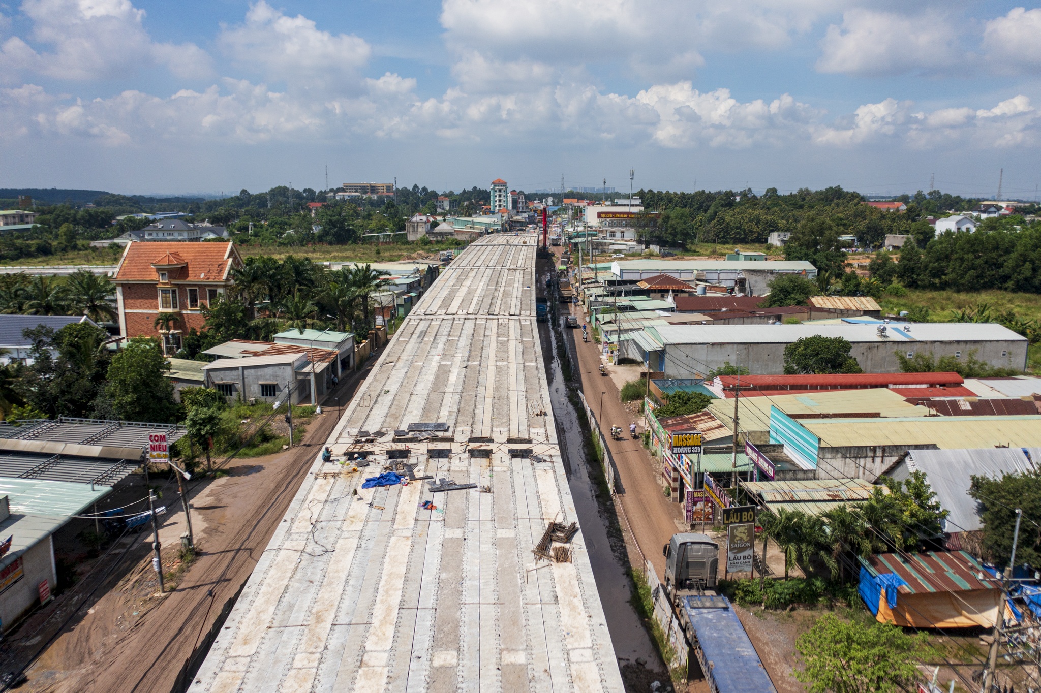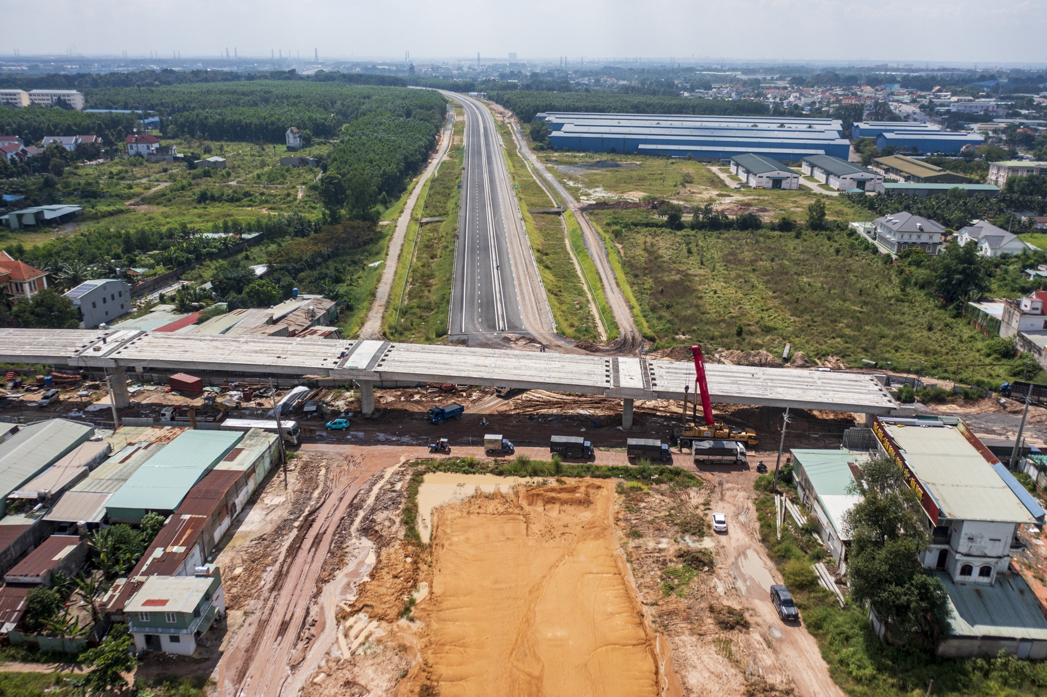 Tại dự án thành phần 1, ông Nguyễn Linh, Phó giám đốc Ban Quản lý dự án đầu tư xây dựng tỉnh Đồng Nai cho biết các gói thầu 18 và 21 đang triển khai đồng bộ từ Km0+000 đến Km16+000. Giá trị thi công đạt gần 60%. Trong ảnh là điểm đầu dự án ở khu vực giao với đường Võ Nguyên Giáp thuộc dự án thành phần 1 (phường Phước Tân, tỉnh Đồng Nai) đã được nhà thầu gác dầm hoàn thành cầu vượt ngang.
