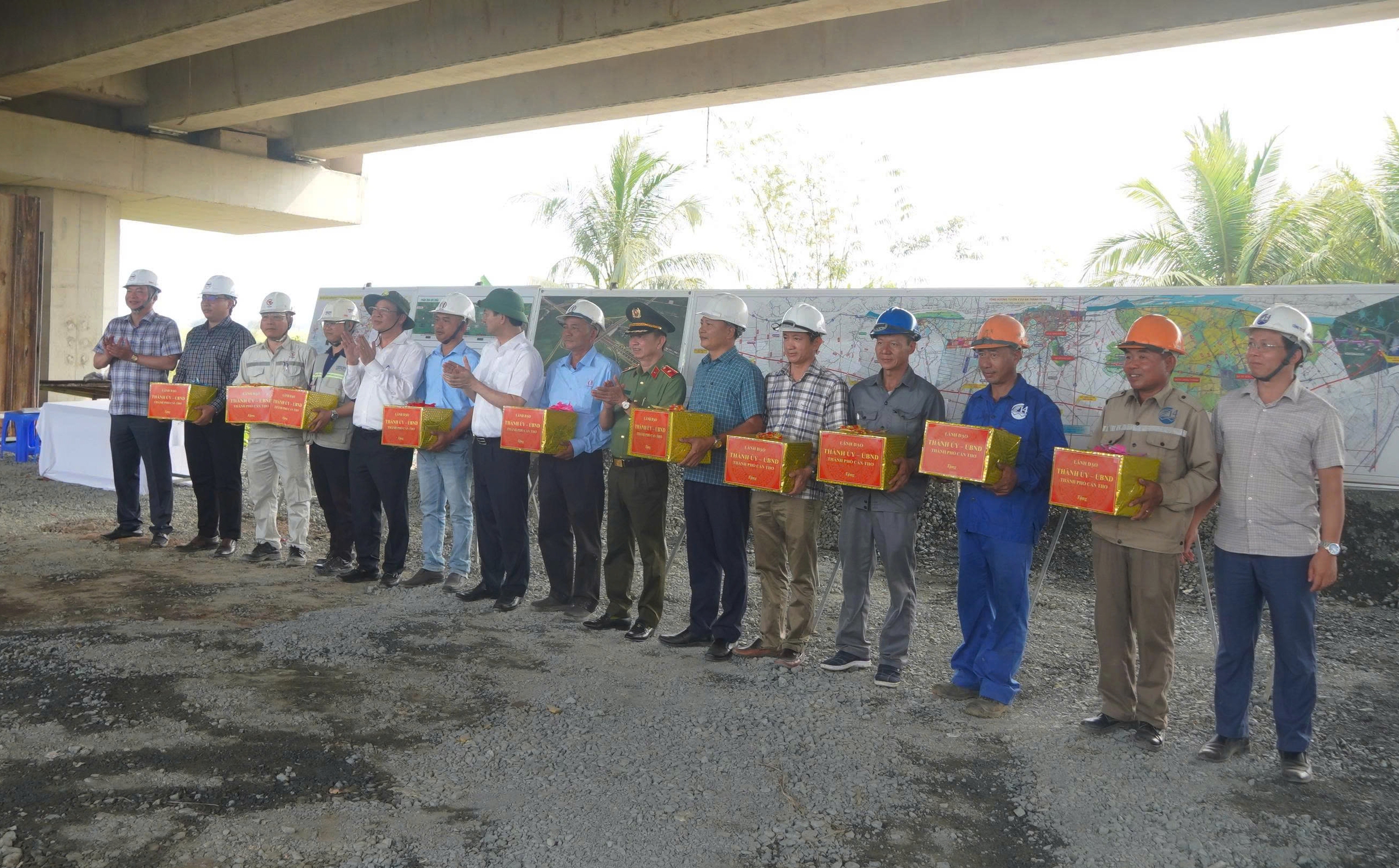 Đoàn công tác lãnh đạo TP Cần Thơ tăng quà cho các công nhân thi công dự án.