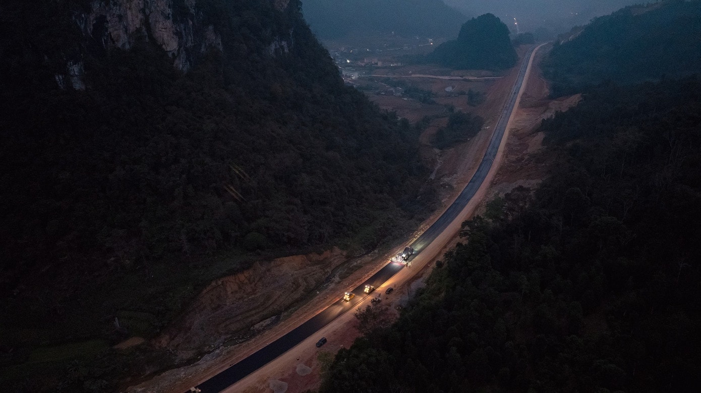 Tại khu vực Km58 (xã Đông Khê, tỉnh Cao Bằng), lực lượng thi công đã trải thảm được hơn 1km bê tông nhựa sau hai ngày triển khai, duy trì thi công cả ngày lẫn đêm.
