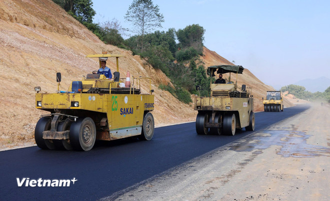 Dự án cao tốc Tuyên Quang-Hà Giang đang phấn đấu hoàn thành kết cấu mặt đường để đảm bảo thông xe trước ngày 19/12 tới. (Ảnh: Khánh Hùng/Vietnam+)