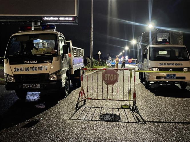 Lực lượng Công an, dân phòng Quảng Ngãi xuyên đêm điều tiết giao thông qua khu vực cầu Trà Khúc 1 đang bị cấm lưu thông do nước lũ. Ảnh: Phạm Cường/TTXVN
