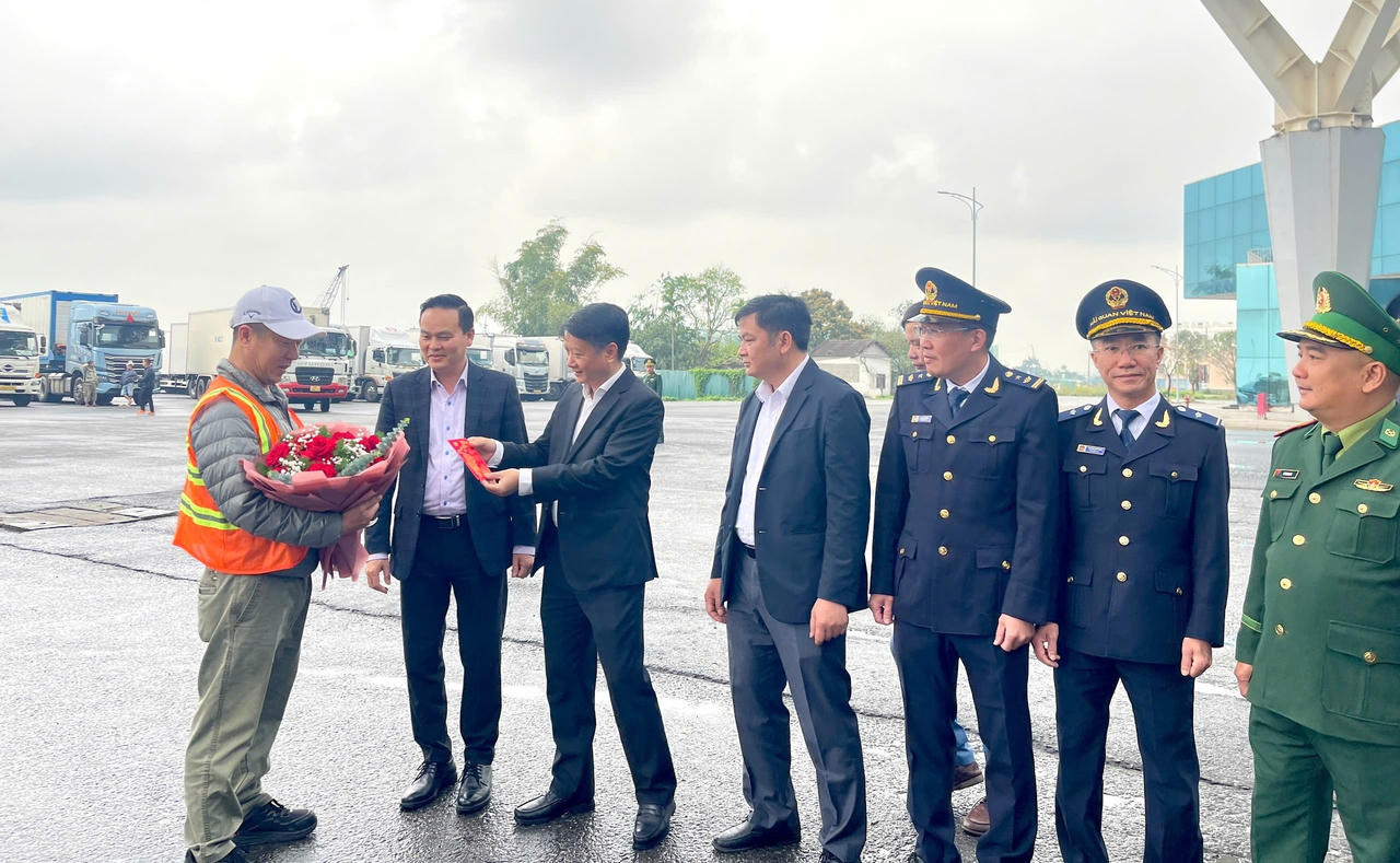 Các cơ quan chức năng chào đón, tặng hoa chúc mừng doanh nghiệp có lô hàng XNK đầu tiên thông quan ngày cuối tuần.