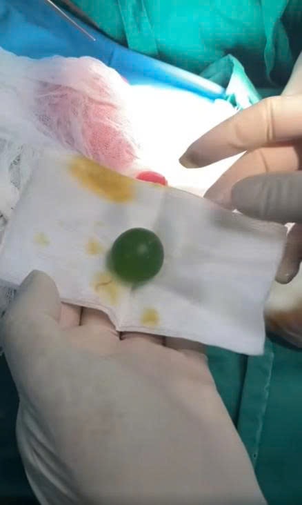 Sau hội chẩn khẩn, các bác sĩ xác định bé bị tắc ruột do dị vật và chỉ định phẫu thuật cấp cứu. Dị vật được lấy ra là một hạt nở đường kính gần 2 cm, đã phình to tối đa sau khi hút nước trong ruột. Rất may, dù hạt nở gây chèn ép mạnh, đoạn ruột bị tắc chưa hoại tử, giúp ca mổ diễn ra thuận lợi.