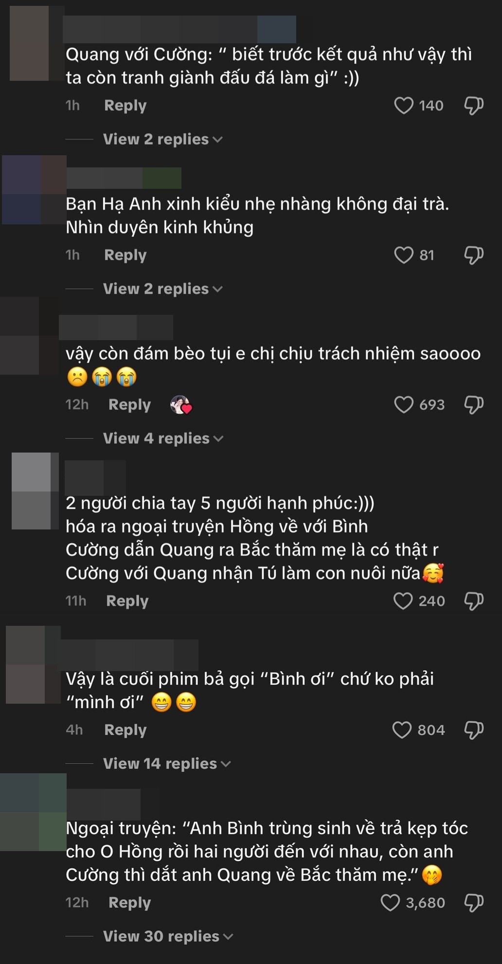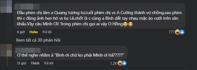 Có khán giả cho rằng O Hồng lại là mỹ nhân "được lợi" nhất phim khi ban đầu khiến Quang (Steven Nguyễn) tương tư, sau đó có mối tình đẹp nhưng dở dang với Cường. Ngoài đời, nữ diễn viên Lê Hạ Anh thường xuyên đăng ảnh thân thiết với bác sĩ Lê (Hứa Vĩ Văn), rồi giờ còn mặc váy cưới khoác tay Bình trên lễ đường. "Vậy hai chữ 'Mình ơi', O Hồng dành cho ai?", một bình luận khiến ai nấy dở khóc dở cười.