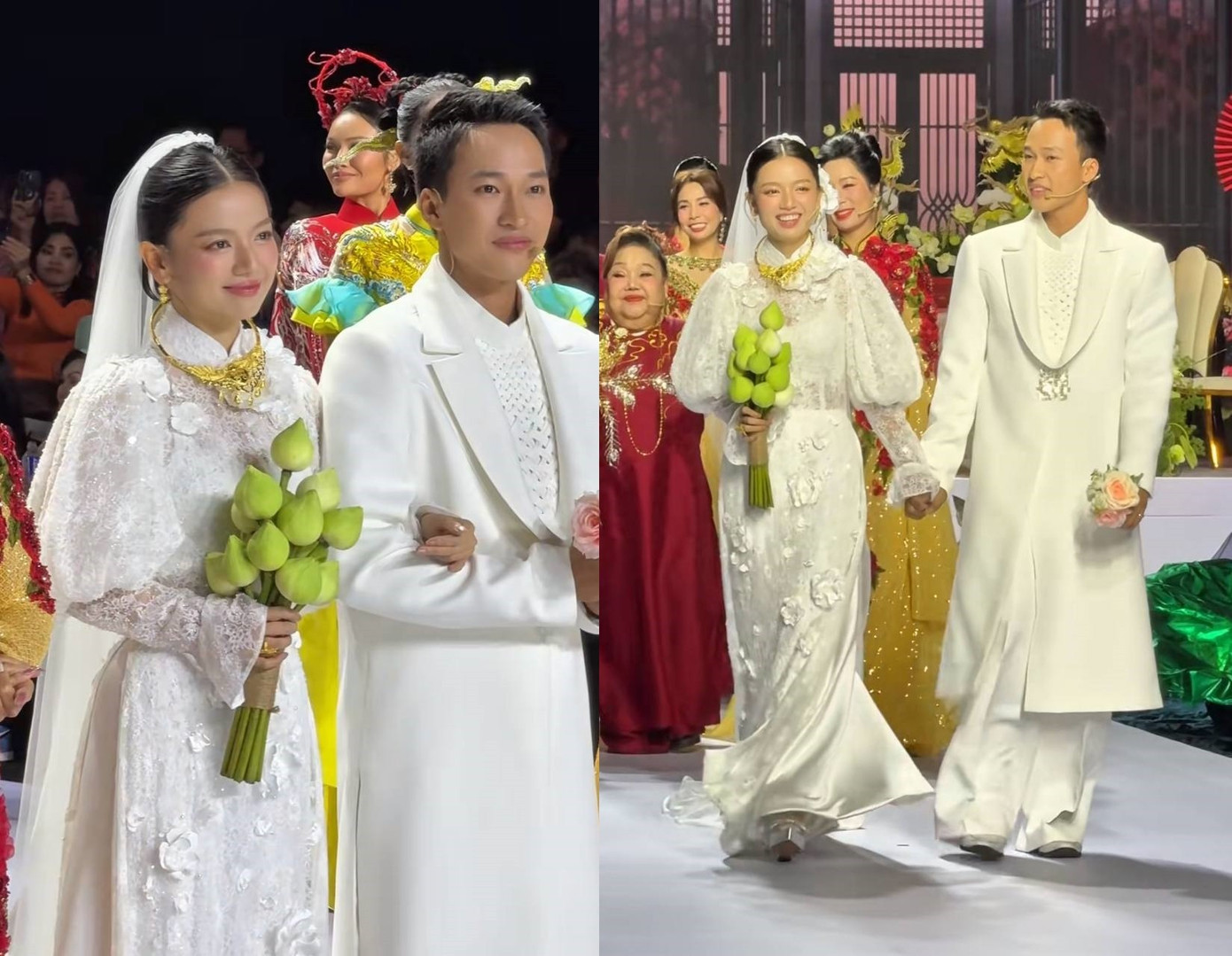 Lâm Thanh Nhã và Lê Hạ Anh sải bước trong trang phục cưới. Nguồn: TikTok Lê Hạ Anh