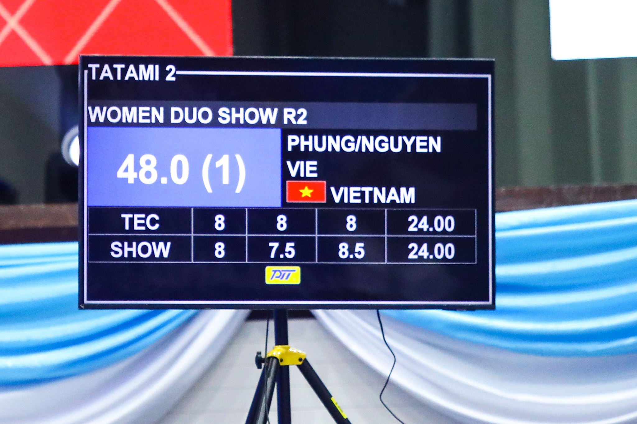 Cặp đôi VĐV Phùng Thị Hồng Ngọc và Nguyễn Ngọc Bích chỉ đứng sau hai cặp VĐV chủ nhà ở chung kết biểu diễn nữ môn ju-jitsu. Ảnh: Minh Chiến.