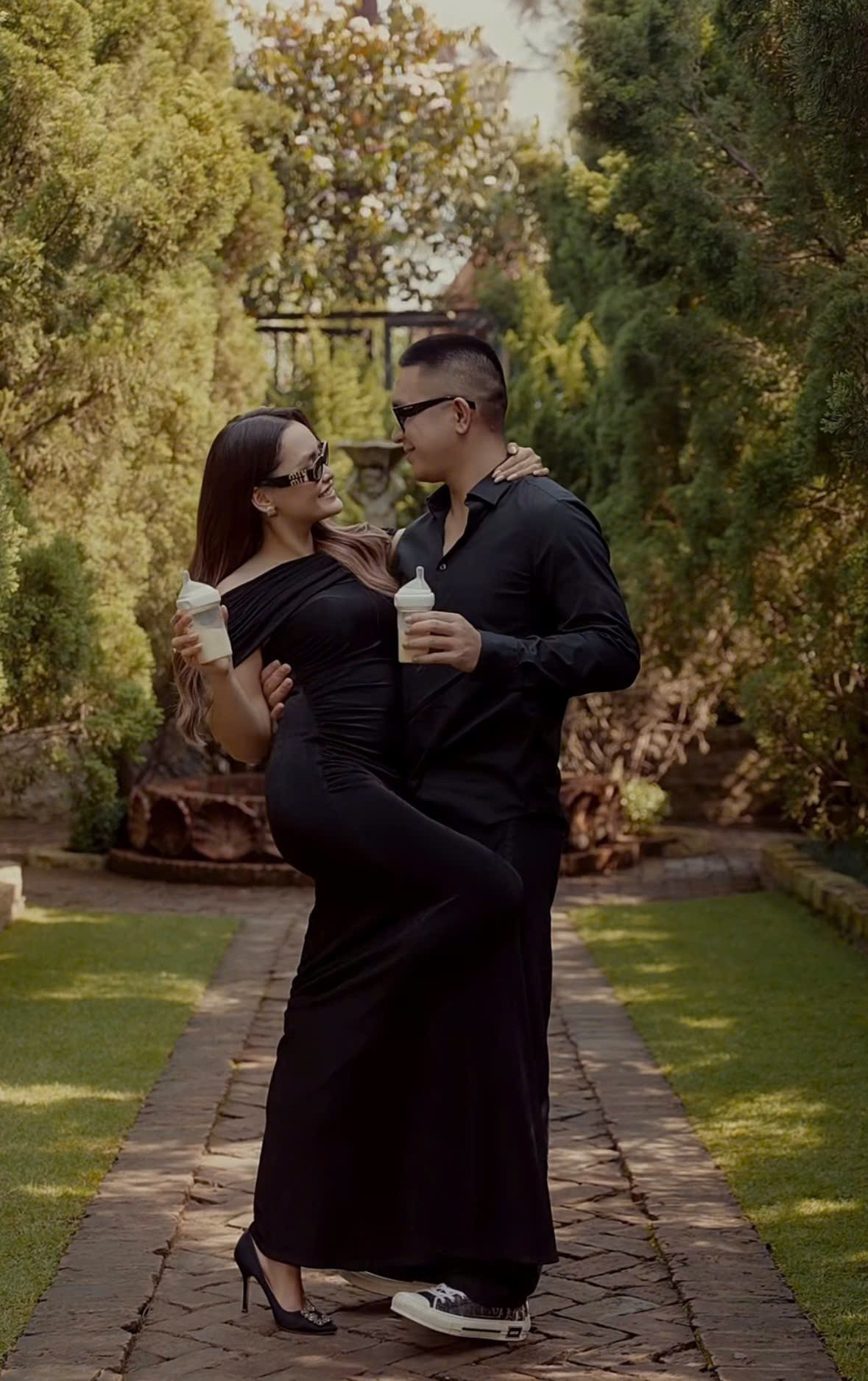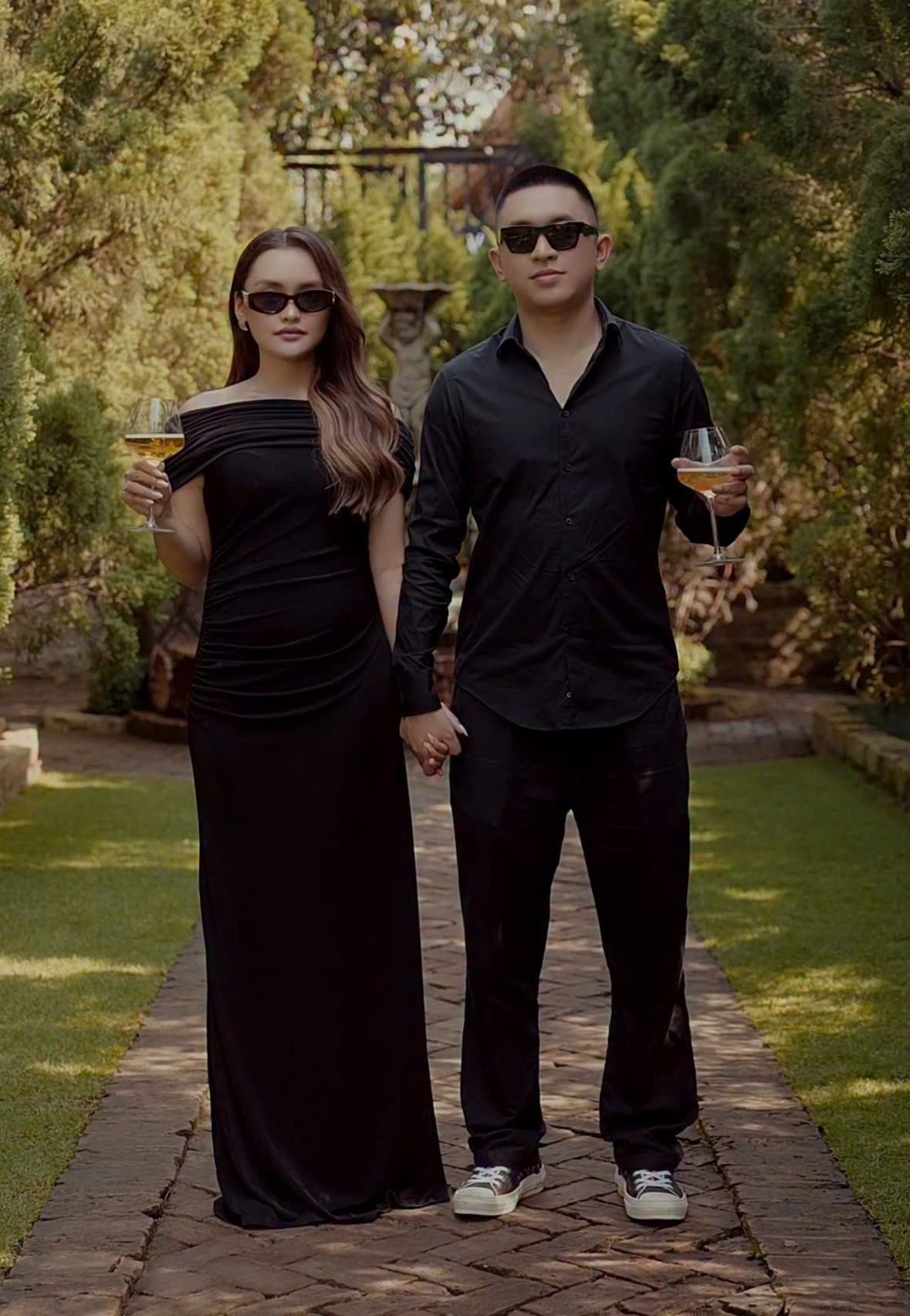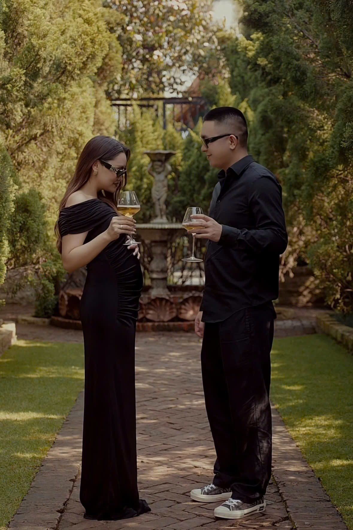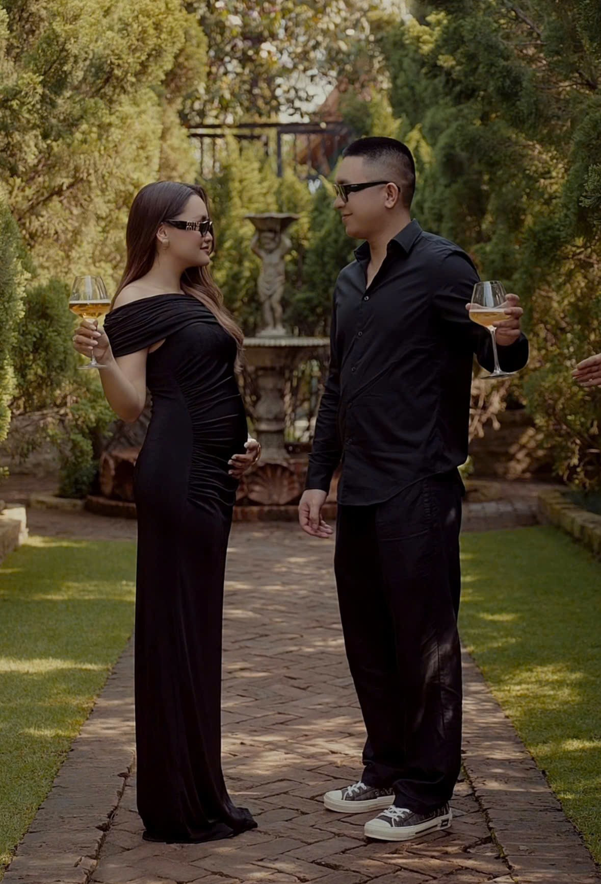 Trong bộ ảnh, Linda Ngô khoe trọn vóc dáng quyến rũ cùng chiếc bụng bầu đáng yêu trong chiếc đầm đen bó sát, trễ vai. Phong Đạt luôn đồng hành, ân cần ôm trọn vợ, ánh mắt không rời khỏi cô và em bé. (Ảnh: FBNV)