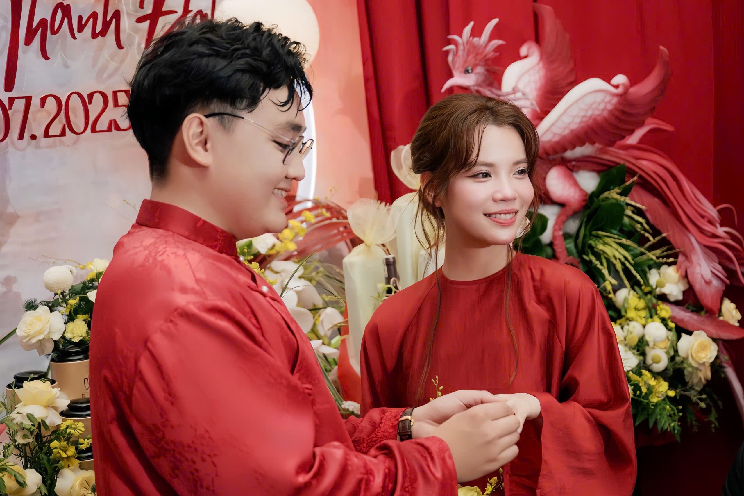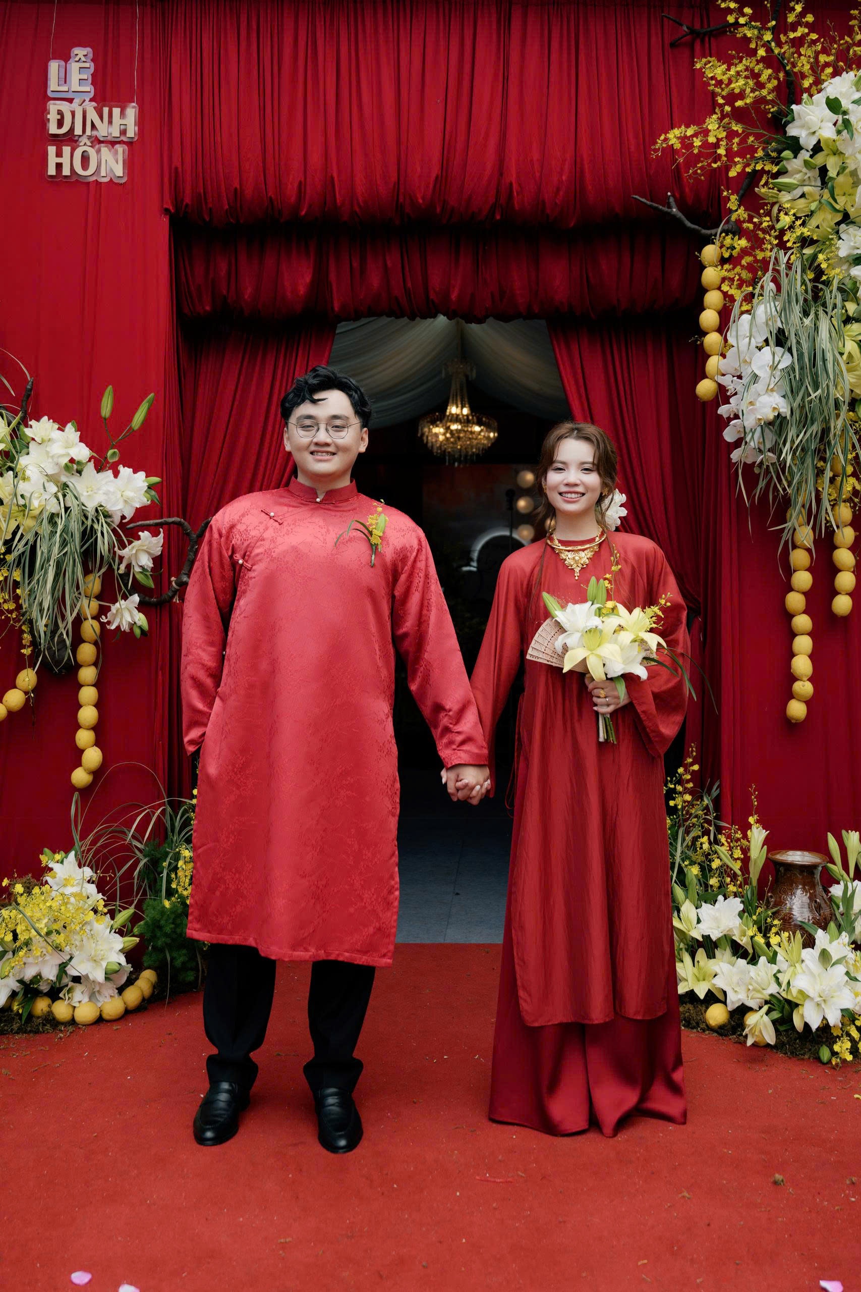 Vừa qua, lễ đính hôn của cặp đôi được tổ chức ngày 12/7 tại nhà cô dâu, lấy tông đỏ làm chủ đạo, kết hợp các gam màu nóng lấy cảm hứng từ quê hương Gia Lai. Không gian được trang trí bằng hoa ly - loài hoa gắn liền với tên cô và tượng trưng cho sự hòa hợp, kết hợp cùng hạt cà phê và chum rượu gốm, gợi nhớ về mối lương duyên từ Cao Bằng.