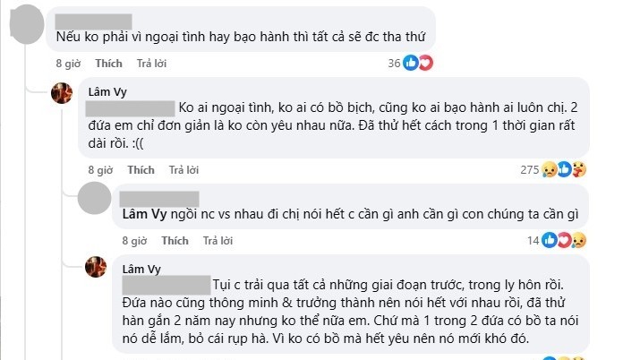 Song, bà mẹ một con nhanh chóng phủ nhận, Lâm Vy cũng để lại bình luận chia sẻ lý do ly hôn là bởi: "Không ai ngoại tình, không ai có bồ, cũng không ai bạo hành ai luôn chị. Hai đứa em chỉ đơn giản là không còn yêu nhau nữa. Đã thử hết cách trong một thời gian rất dài rồi.