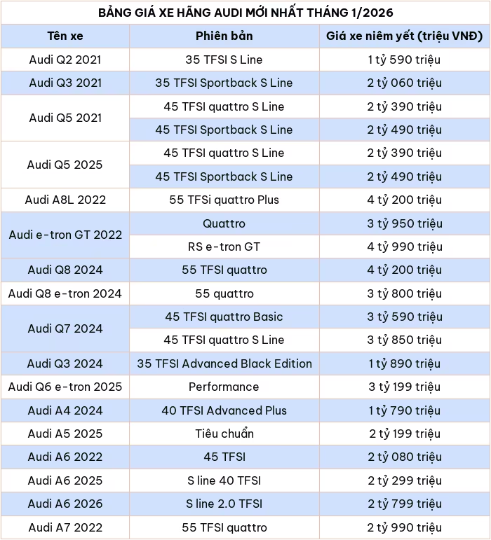 Trên đây là bảng giá xe ô tô hãng Audi mới nhất tháng 1/2026 tại Việt Nam chưa bao gồm chi phí lăn bánh.
