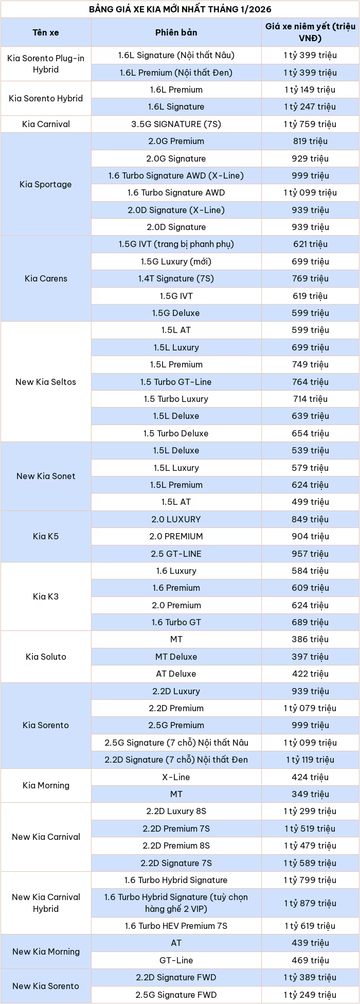 Trên đây là bảng giá xe ô tô của hãng Kia mới nhất tháng 1/2026 tại Việt Nam chưa bao gồm chi phí lăn bánh.