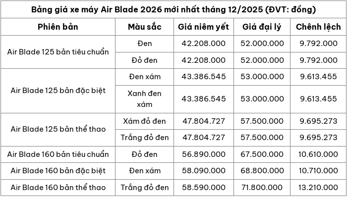 Bảng giá xe máy Air Blade 2026 mới nhất tháng 12/2025 (Nguồn: Honda)