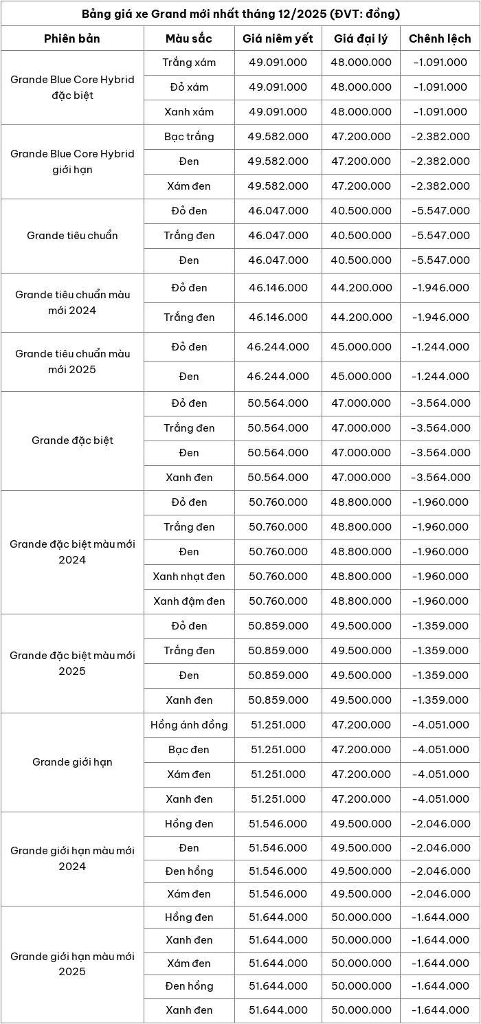 Hiện giá xe máy Grande tại các đại lý trong tháng 12/2025 nhìn chung vẫn ổn định. Giá bán thực tế đang thấp hơn giá đề xuất khoảng 1.091.000 - 5.547.000 đồng/xe, giá chênh lệch cao nhất được ghi nhận đối với mẫu xe Grande tiêu chuẩn.