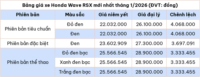 Trong tháng 1/2026, xe số Honda Wave RSX tiếp tục đưa ra thị trường với 3 phiên bản như: Thể thao, tiêu chuẩn và đặc biệt. Đi kèm cùng 4 tùy chọn màu sắc: Đỏ đen, xanh đen, xám đen và đen.