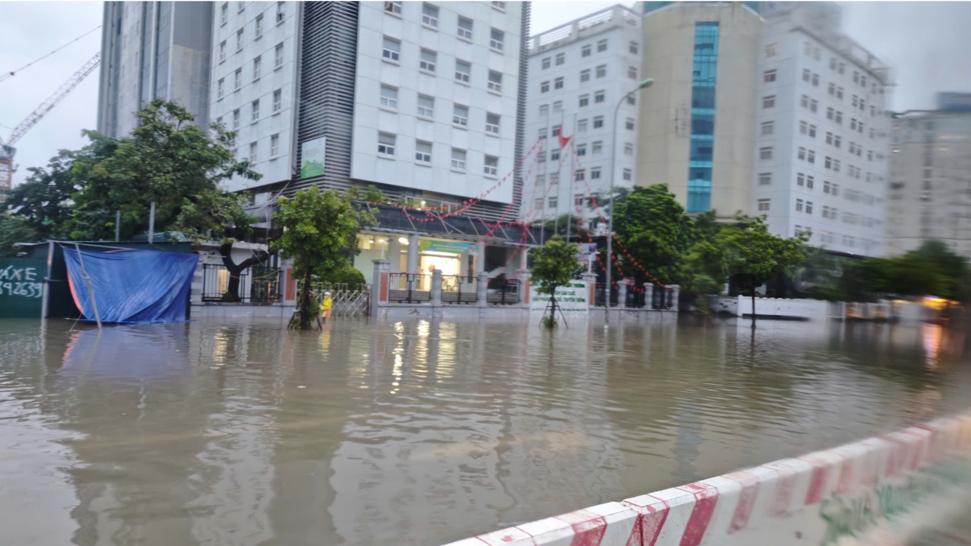 - Trên đường Duy Tân, khu vực trước khách sạn Novotel bị ngập sâu, khiến việc di chuyển gặp nhiều khó khăn.