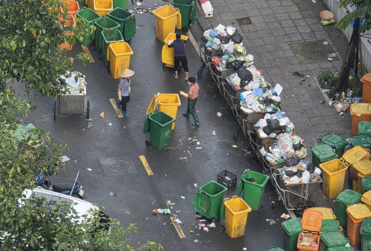 Khu Ecohome 3 sáng 8/10 nước đã rút dần, công nhân tiến hành thu gom rác thải.