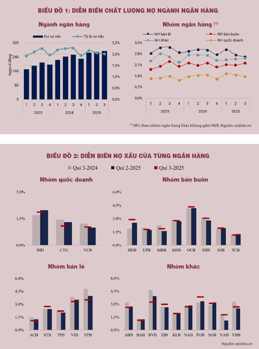 Tổng thể, chất lượng nợ của ngành ngân hàng trong quí 3-2025 tiếp tục đà cải thiện so với quí 2, cho thấy hiệu quả của quá trình cơ cấu và xử lý nợ xấu. Tuy vậy, sự thận trọng vẫn cần duy trì, khi tốc độ mở rộng tín dụng còn cao và tỷ lệ nợ xấu chưa trở về mức ổn định dài hạn, đặc biệt ở nhóm ngân hàng nhỏ và bán buôn.