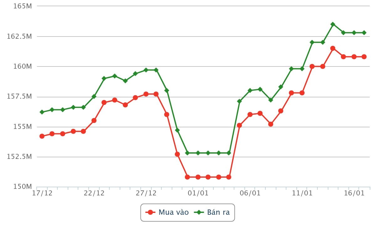 Cùng thời điểm, PNJ không ghi nhận biến động mới. Giá vàng miếng tại đây đang được mua vào ở mức 160,8 triệu đồng/lượng và bán ra ở 162,8 triệu đồng/lượng. Chênh lệch giữa hai chiều tiếp tục duy trì ở 2 triệu đồng/lượng.