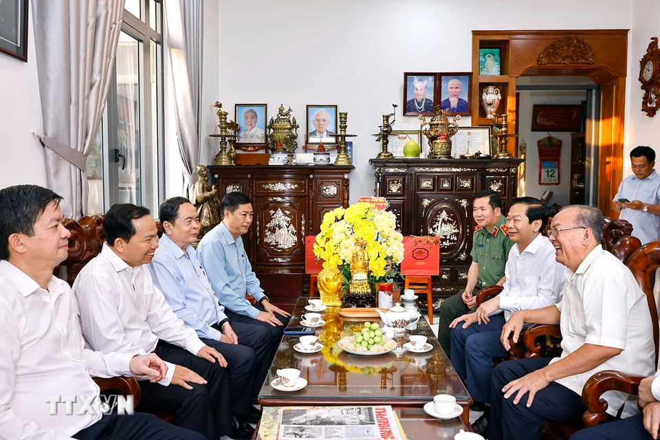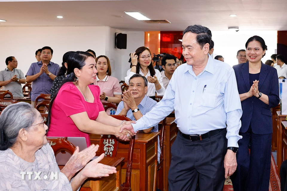 Chủ tịch Quốc hội Trần Thanh Mẫn gặp mặt các đồng chí lãnh đạo, nguyên lãnh đạo thành phố qua các thời kỳ. (Ảnh: Doãn Tấn/TTXVN)