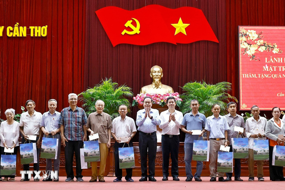 Chủ tịch Quốc hội Trần Thanh Mẫn tặng quà cho gia đình chính sách, lực lượng vũ trang nhân dân, hộ nghèo, cận nghèo, công nhân lao động trên địa bàn thành phố Cần Thơ. (Ảnh: Doãn Tấn/TTXVN)