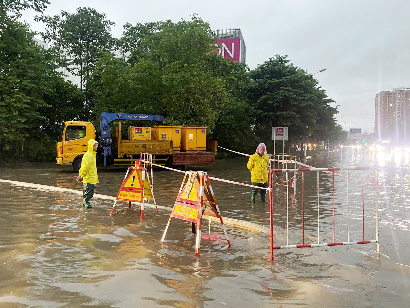 Trên các tuyến Nguyễn Xiển, Đàm Quang Trung, Dương Đình Nghệ, Lê Trọng Tấn, Cầu Bươu - Phạm Tu..., nước ngập sâu 40-50 cm, có nơi đến đầu gối người đi bộ. Để đề phòng rủi ro, lực lượng chức năng và nhân viên Công ty TNHH MTV Thoát nước Hà Nội đã dựng rào cảnh báo, ngăn không cho người và phương tiện đi vào.