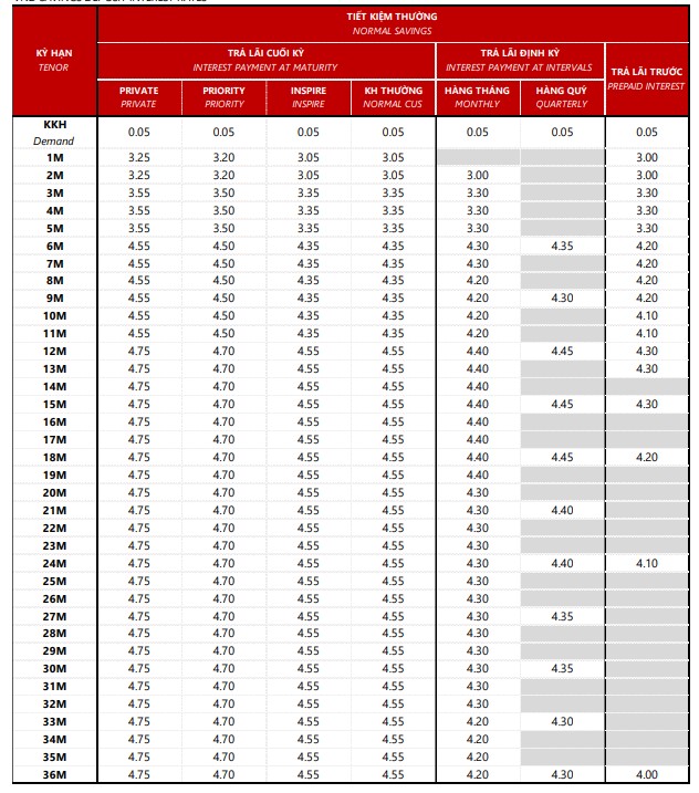 Theo đó, lãi suất tiết kiệm đối với khách hàng cá nhân (khách hàng thường) nhận lãi cuối kỳ hiện dao động từ 3,05% đến 4,55%/năm cho các kỳ hạn từ 1 đến 36 tháng. Đây được xem là mặt bằng lãi suất khá ổn định trong bối cảnh thị trường tiền gửi đang có dấu hiệu nhích nhẹ ở một số kỳ hạn.