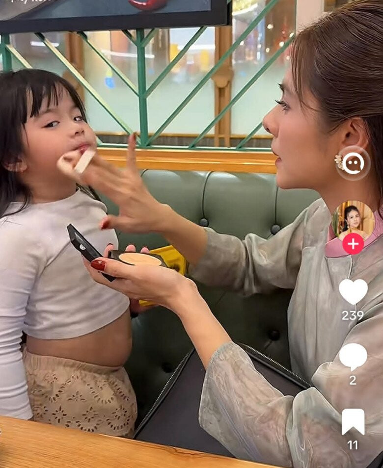 Nữ diễn viên cẩn thận trang điểm cho 2 con trước khi diễn ra sự kiện.