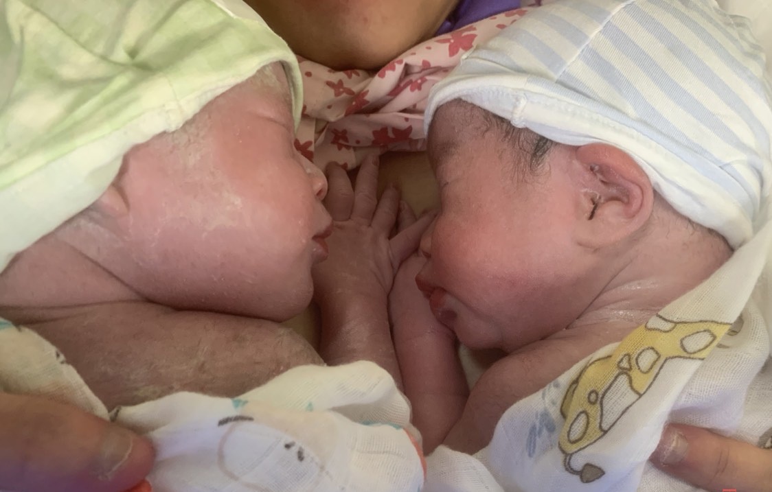 Ngay sau khi chào đời, cả hai bé trai đều được ghép da kề da với mẹ. Sức khỏe của ba mẹ con hiện ổn định.