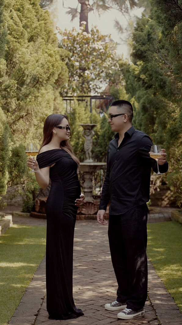 Trong đoạn video, Linda diện váy đen ôm dáng, một tay đặt lên bụng bầu, tay còn lại nâng ly vang. Ánh mắt cô hướng về chồng là Phan Đạt - người đứng đối diện trong trang phục tối màu, cùng nâng ly để chia sẻ khoảnh khắc hạnh phúc của cả hai.