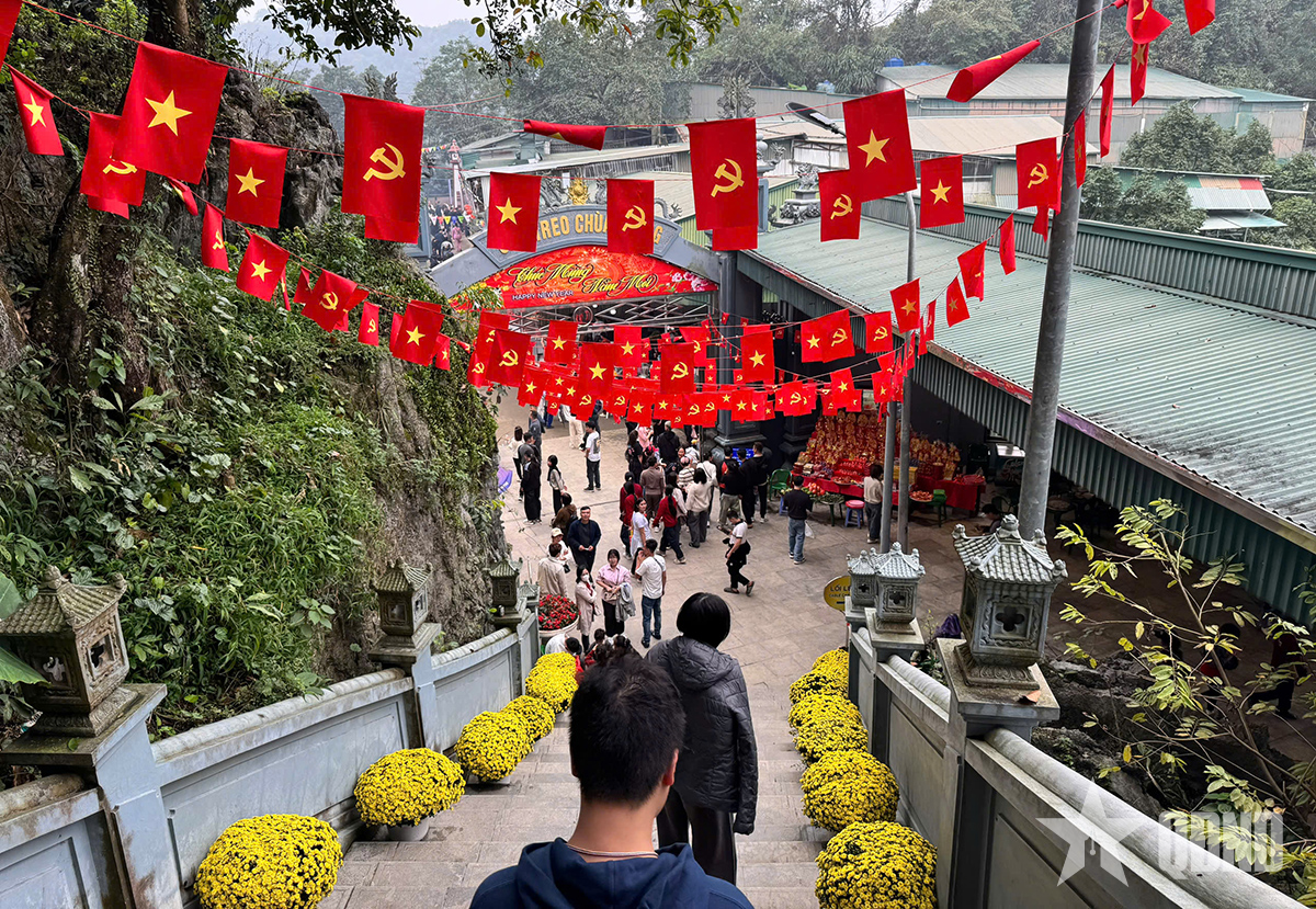 Lực lượng chức năng túc trực tại nhiều địa điểm trong quần thể di tích chùa Hương để bảo đảm an ninh trật tự và hướng dẫn du khách tham quan.