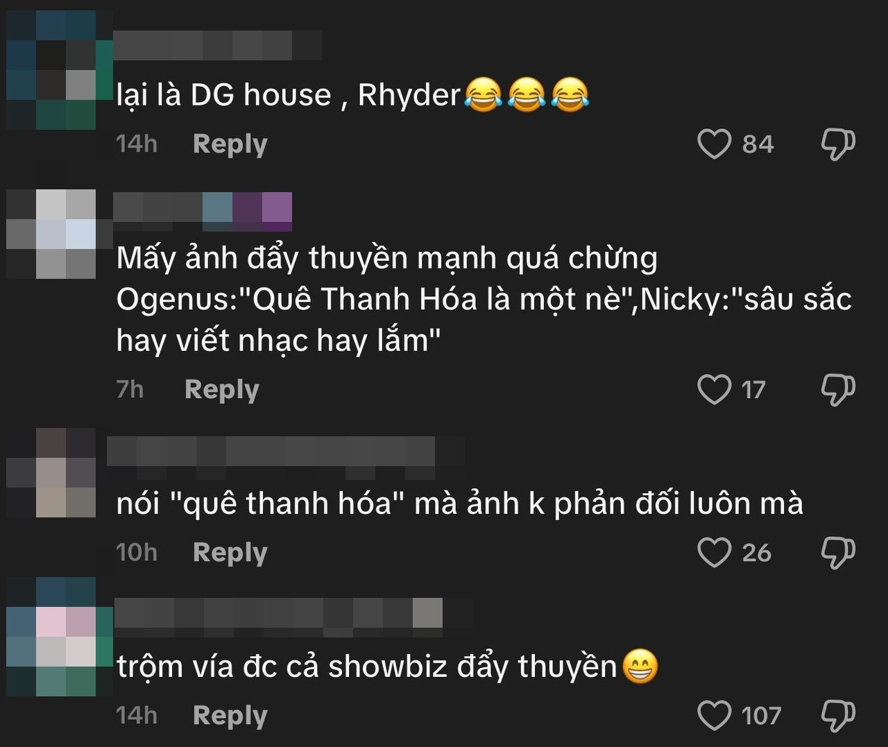 Dưới phần bình luận, cư dân mạng đã liên tục nhắc đến Rhyder, nam ca sĩ có quê quán Thanh Hóa. Ngoài ra, Rhyder còn là "tri kỷ" thân thiết của Captain Boy từ rất lâu, và OgeNus luôn tranh thủ chọc ghẹo 2 anh chàng. Câu trả lời nhanh trí của OgeNus còn khiến Trấn Thành và Nicky cười ngất, còn Captain Boy cũng dở khóc dở cười.