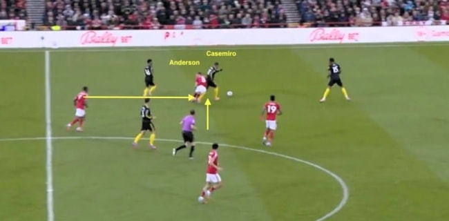 Một vũ khí được khôi phục của Casemiro là đường chuyền dài. Chỉ có năm tiền vệ ở Ngoại hạng Anh thực hiện số đường chuyền dài thành công mỗi trận nhiều hơn anh. Từ vị trí cao hơn so với mùa trước, anh thường xuyên đổi cánh, đặc biệt là quét bóng sang trái; còn từ nửa sân nhà, anh chuyền chính xác cho Bryan Mbeumo ở cánh phải, mở khóa những pha chuyển trạng thái nhanh.