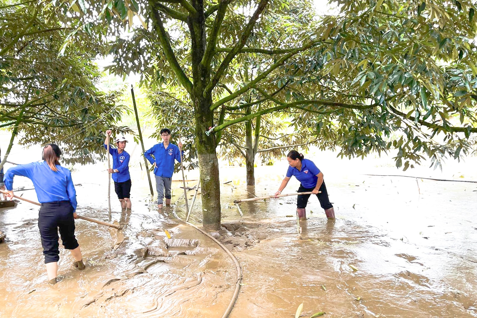 Sau lũ, Đoàn xã Cát Tiên đã huy động tối đa lực lượng tại chỗ, xuống từng vườn hỗ trợ bà con kéo bùn, xịt rửa và khơi thông hệ thống mương nước