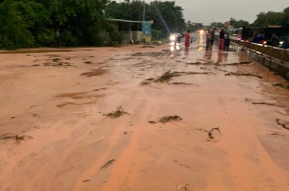Mưa lớn, lũ cát đỏ lại đổ xuống Quốc lộ 1 đoạn Km1651+100 qua xã Lương Sơn. Đây không phải là lần đầu tiên cát tràn xuống đường tại vị trí này khi mưa lớn.