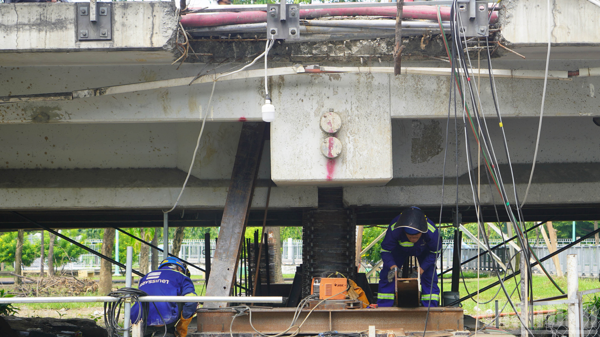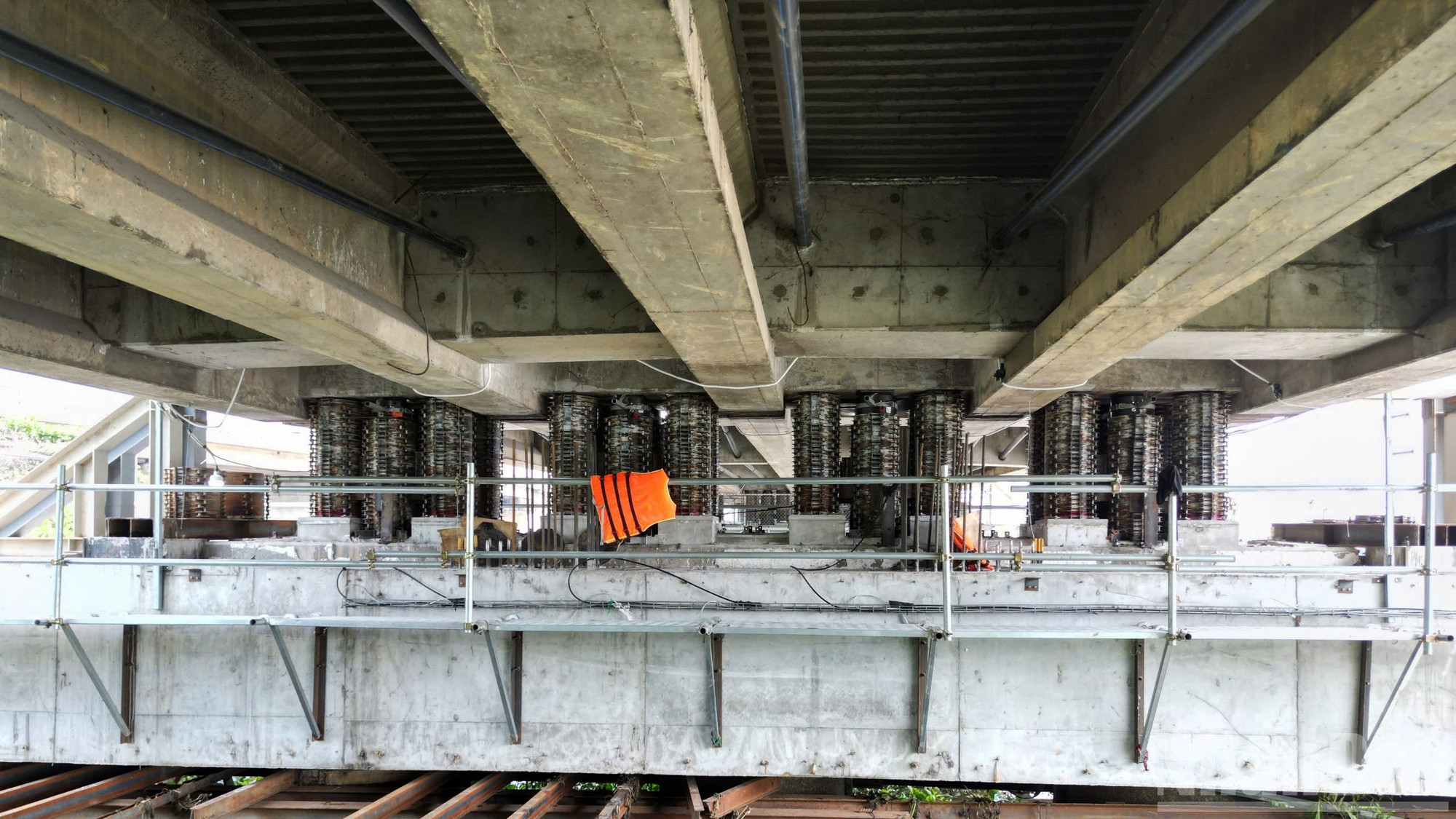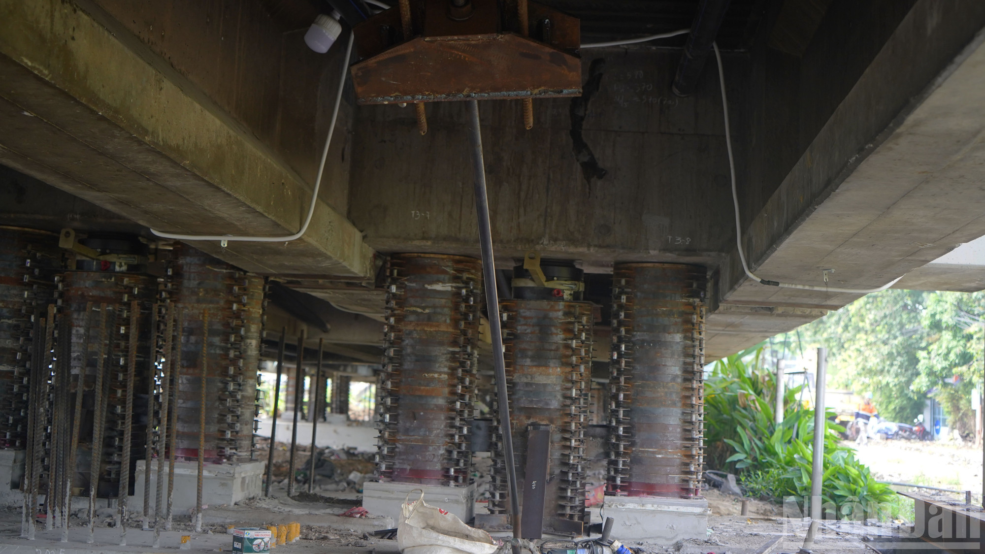 Dưới gầm cầu, hàng trăm tấm kê thép đỡ lấy kết cấu đồ sộ.