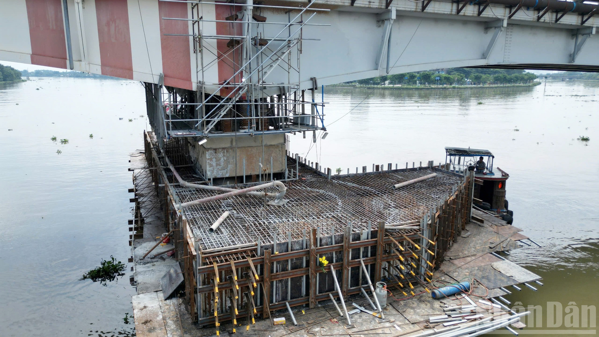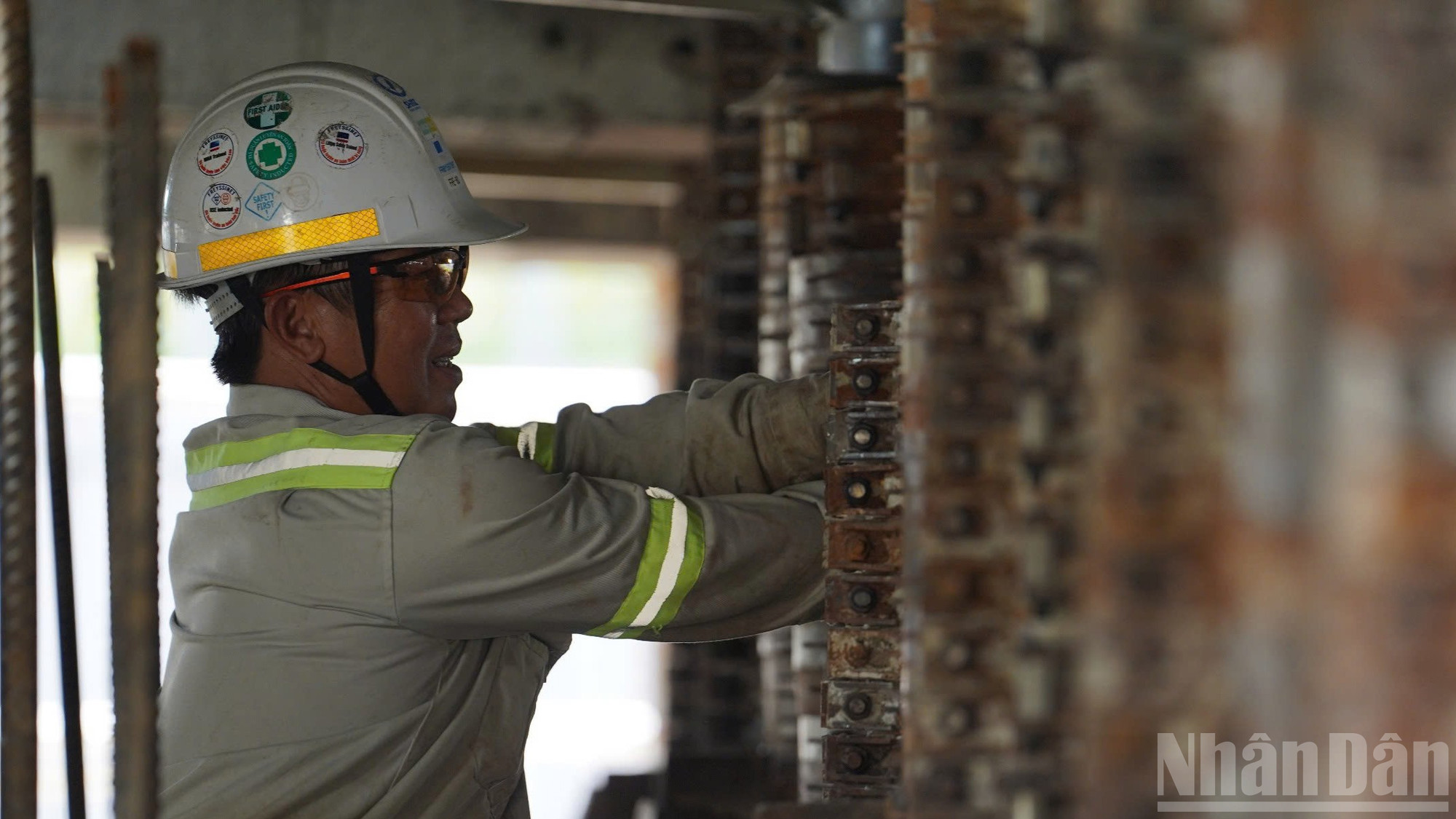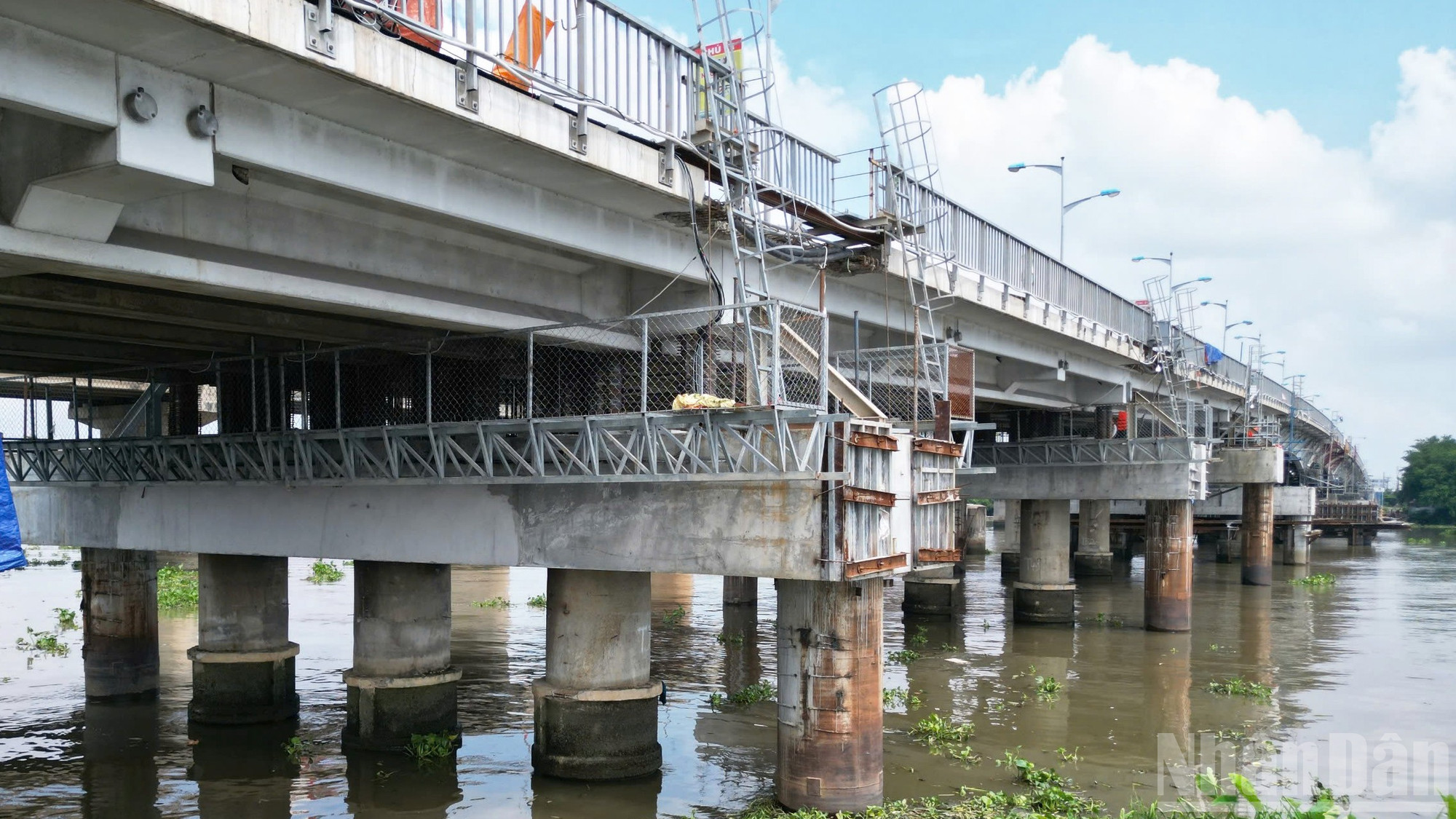 Dưới gầm cầu, hàng trăm tấm kê thép đỡ lấy kết cấu đồ sộ.