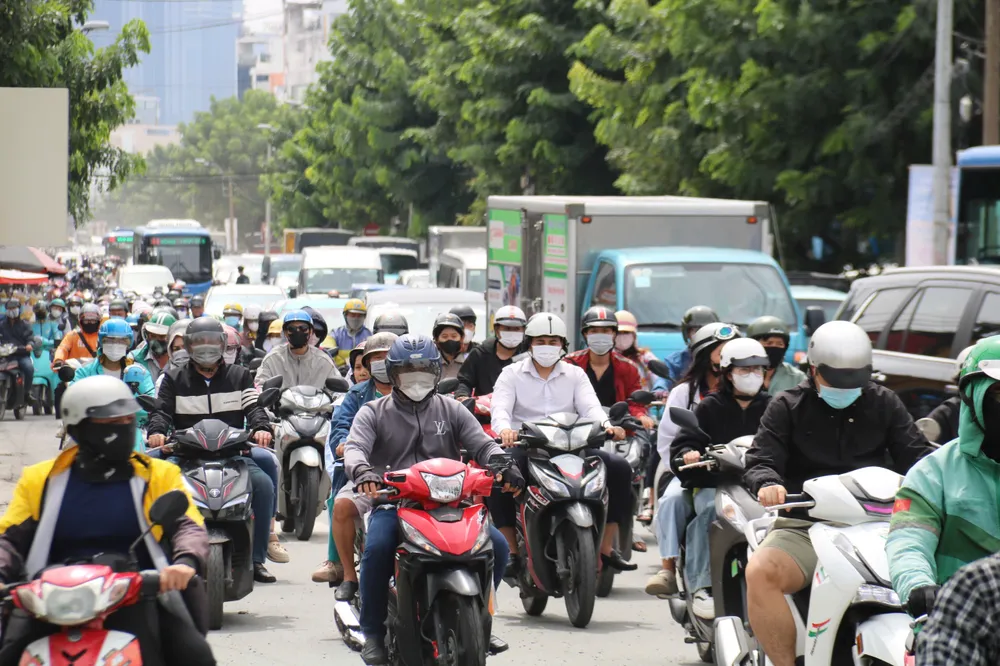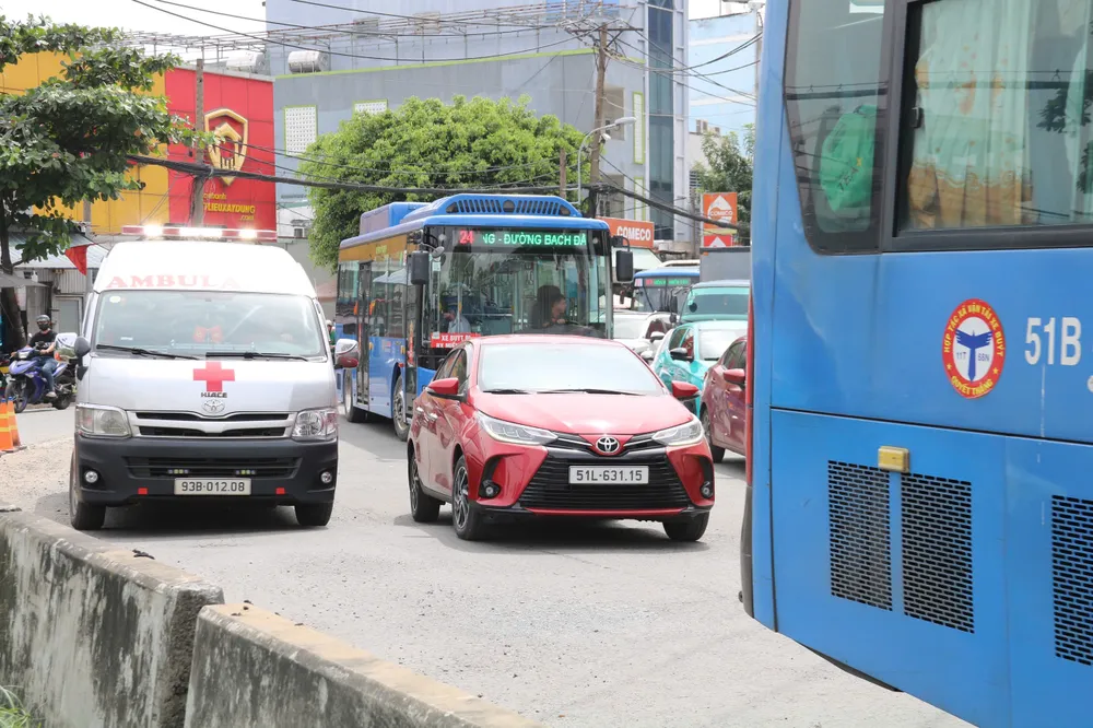 Dẫu không phải giờ cao điểm nhưng dòng xe máy trên Quốc lộ 13 vẫn nhích từng chút một, còn ô tô phải chen chúc, xếp hàng dài để dồn sang cầu Bình Triệu 2. Không ít xe cấp cứu cũng lâm cảnh đứng bánh giữa biển phương tiện.
