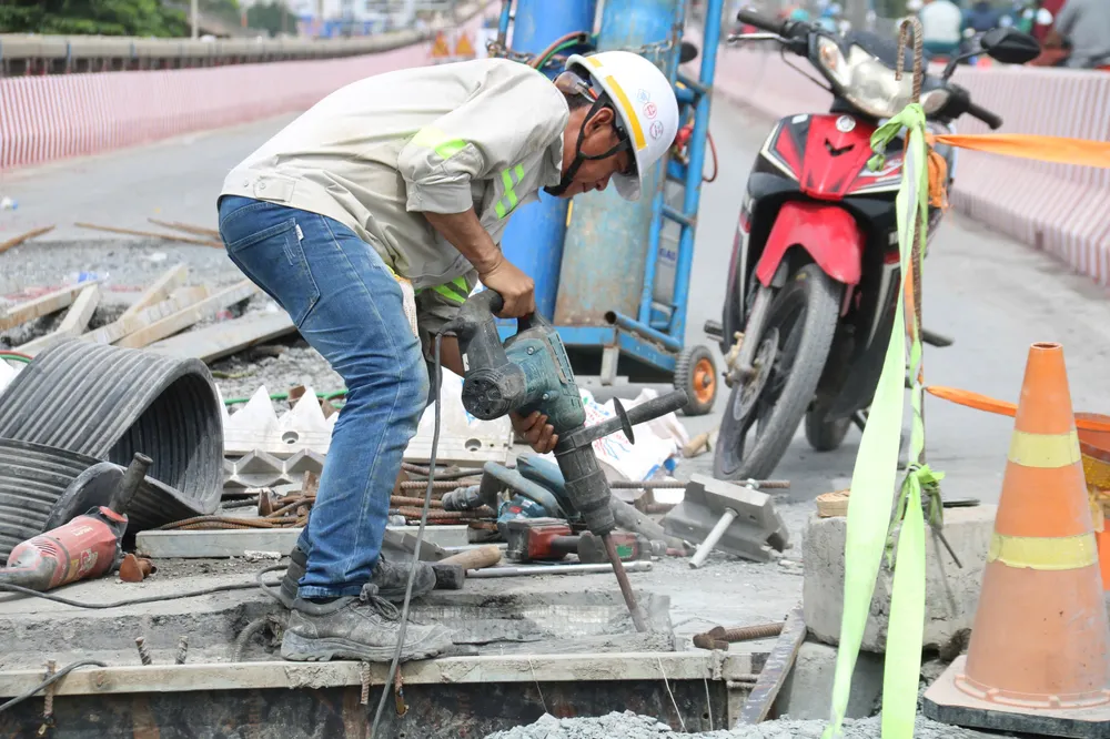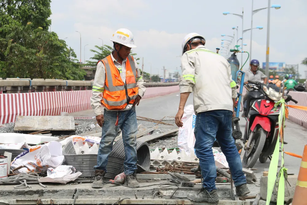 Trên công trường, công nhân và máy móc vẫn làm việc khẩn trương như chạy đua từng giờ để hoàn thiện những hạng mục cuối, sớm trả lại mặt cầu cho người dân sau hơn 3 tháng thi công liên tục.