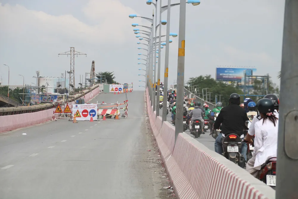 Theo ghi nhận của phóng viên PLO trưa 17-11, cầu Bình Triệu 1 hiện chỉ còn một làn bên phải dành cho xe máy lưu thông (hướng từ phường Bình Thạnh đi Hiệp Bình), toàn bộ phần đường cho ô tô được trưng dụng làm mặt bằng thi công.