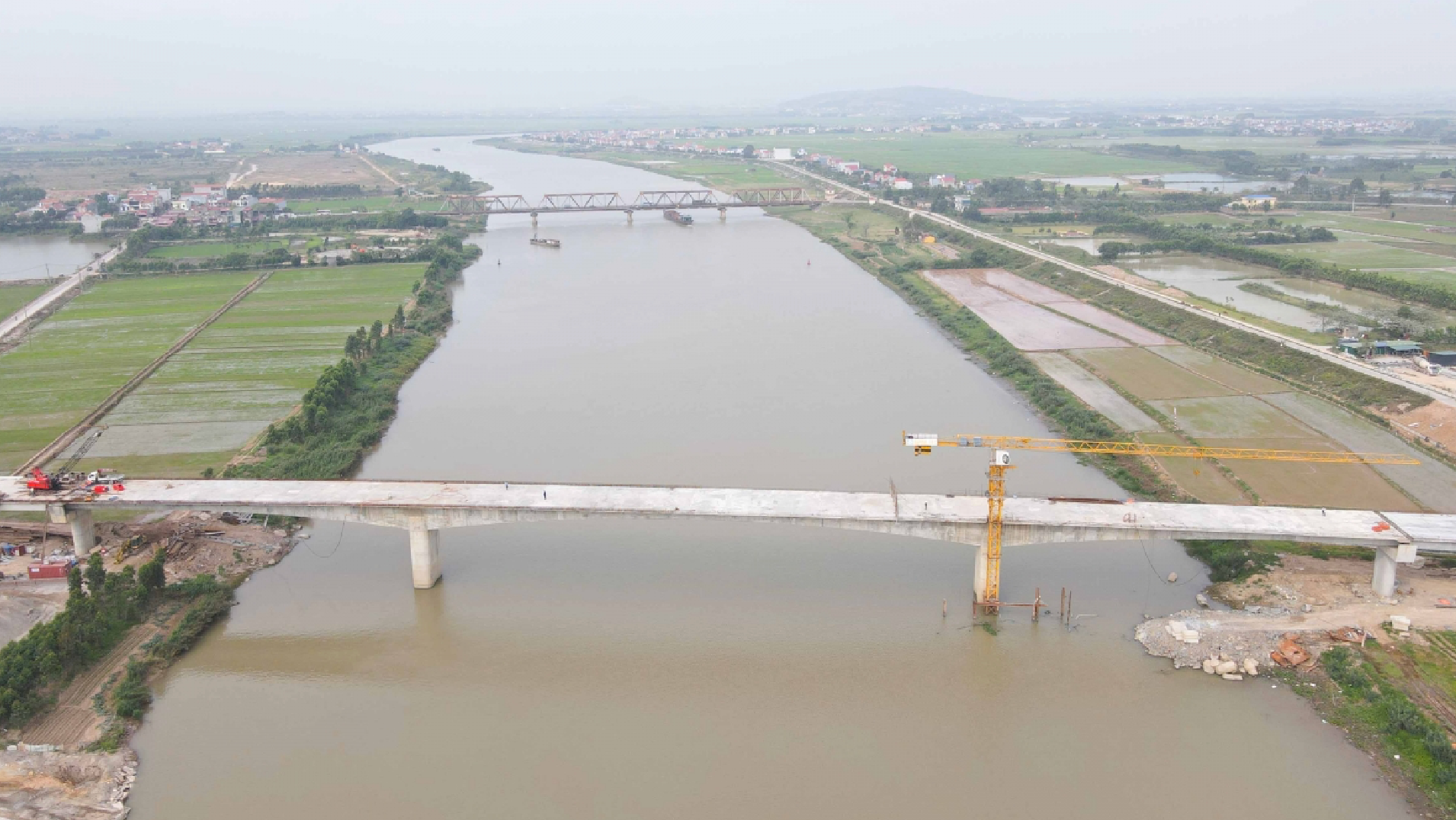 Tại công trường, các đơn vị thi công đang tập trung nhân lực để thảm mặt cầu, lắp đặt lan can và khe co giãn. Đối với phần đường dẫn, nền đường cơ bản đã hoàn thành, nhà thầu đang triển khai đắp đất K95, K98, cấp phối đá dăm và hệ thống thoát nước dọc.