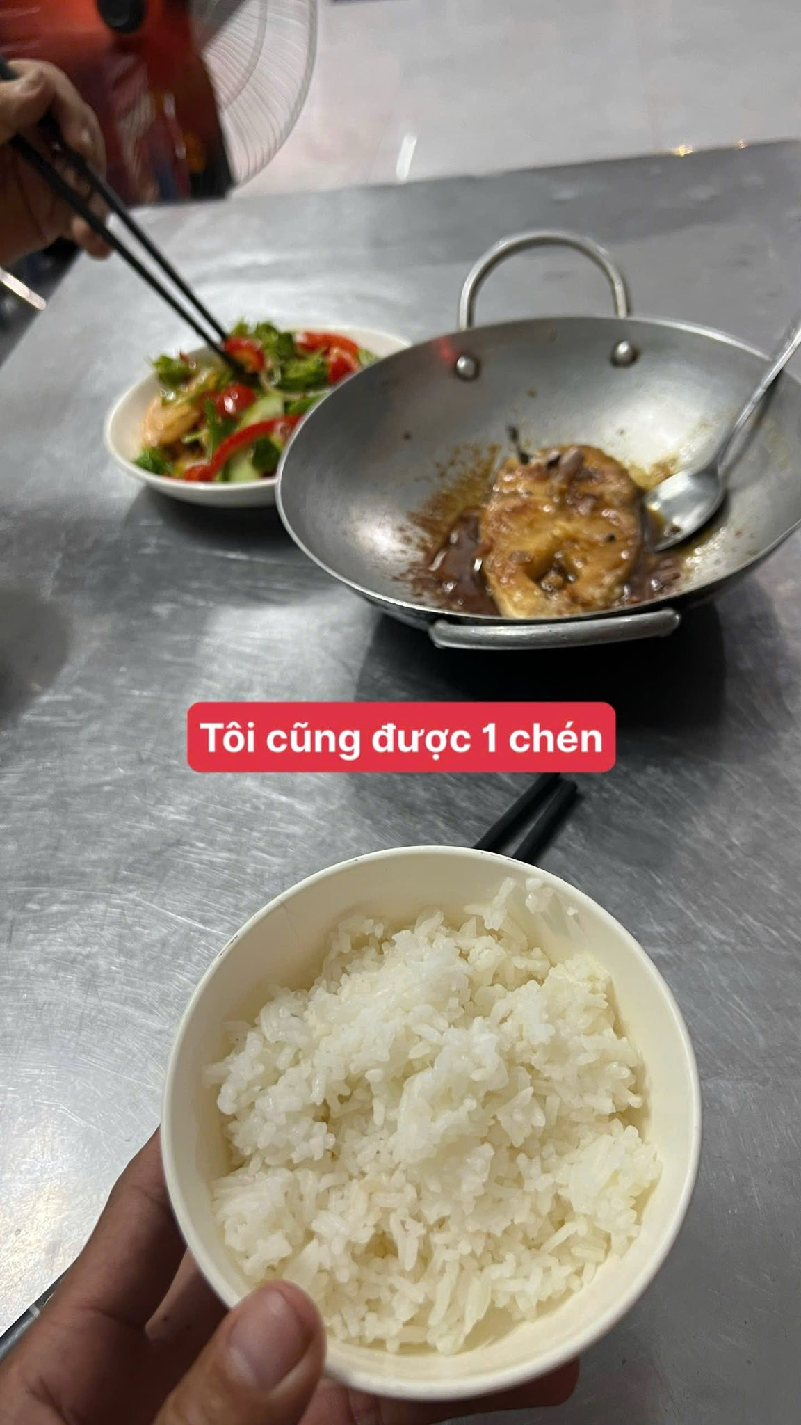 Điều bất ngờ nhất đã xảy ra khi khách hàng đang chờ bỗng được mời nhập tiệc. Hình ảnh chén cơm trắng đầy đặn cùng món cá kho tộ đậm đà và món gỏi rau củ tươi ngon khiến ai cũng phải xuýt xoa.