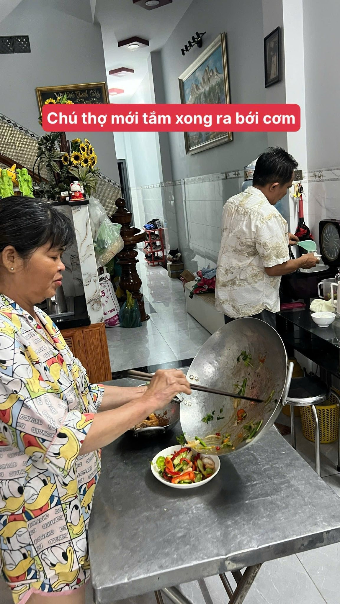 Trong lúc thợ đang tắm, vợ chủ tiệm đã bắt đầu dọn cơm tối: "Thấy vợ Chú cắt tóc đang dọn cơm". Ngay sau đó, thợ cắt tóc, cũng vừa tắm xong và nhanh chóng ra bới cơm: "Chú thợ mới tắm xong ra bới cơm" .