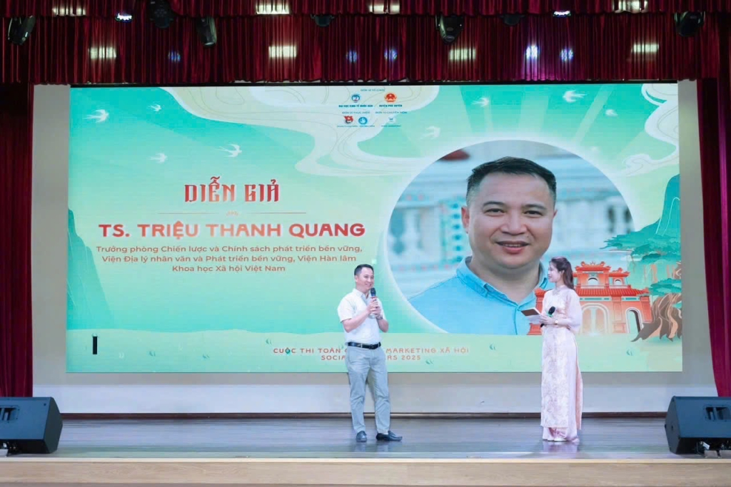 Tiến sĩ Triệu Thanh Quang trong buổi chia sẻ với sinh viên Đại học kinh tế Quốc dân Hà Nội về chủ đề “Sống cùng di sản: Khi ngưởi trẻ viết tiếp câu chuyện văn hóa”.