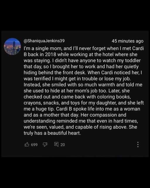 Mới đây, một tài khoản mạng xã hội đã chia sẻ câu chuyện xúc động về lần gặp gỡ Cardi B vào năm 2018, khi cô được nữ rapper ra tay giúp đỡ. Người này kể lại rằng, thời điểm đó cô là một bà mẹ đơn thân làm việc tại một khách sạn ở New York và phải làm việc cật lực để trang trải cho cuộc sống. Một hôm, người giữ trẻ bất ngờ hủy lịch buộc cô phải mang con gái nhỏ đến chỗ làm. Vì sợ bị sa thải, cô lén để bé ngồi yên sau quầy lễ tân và hy vọng không ai phát hiện.