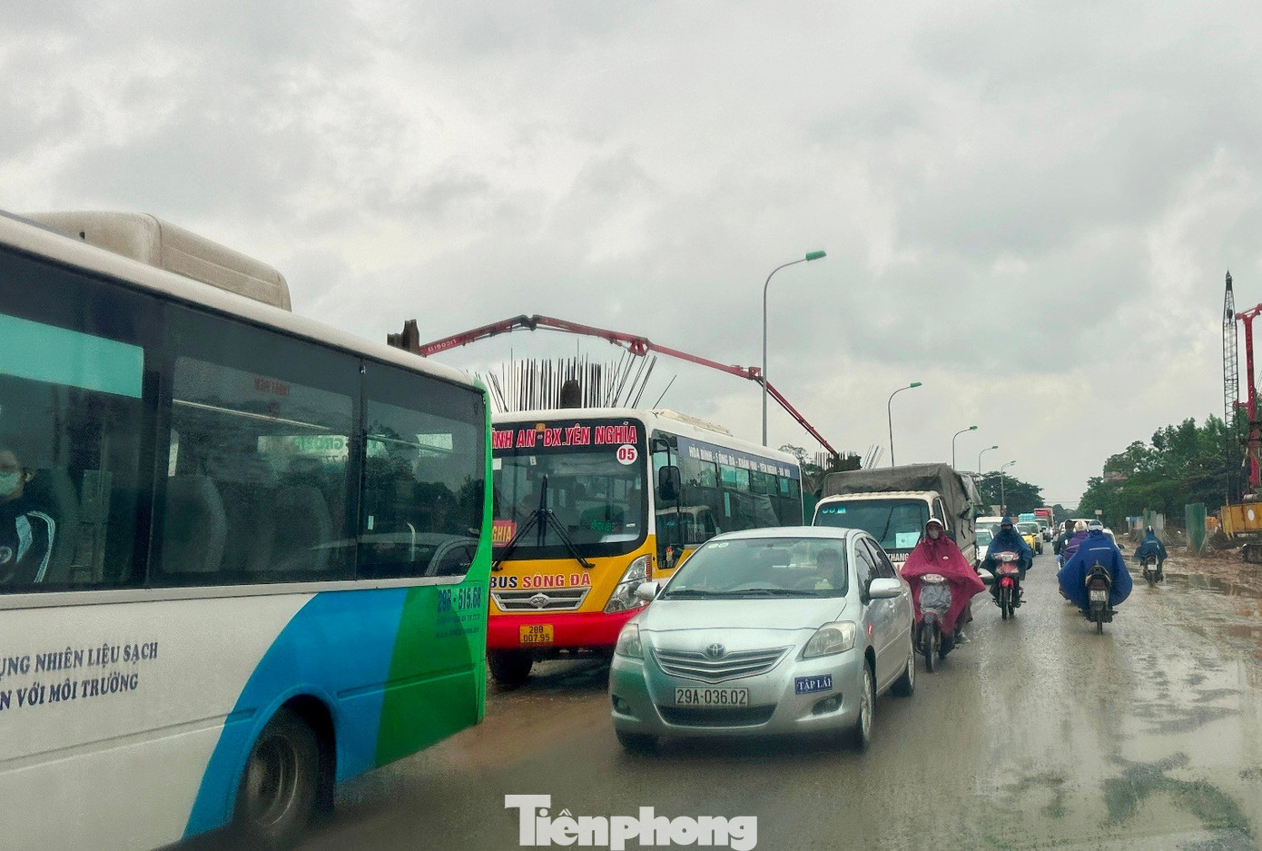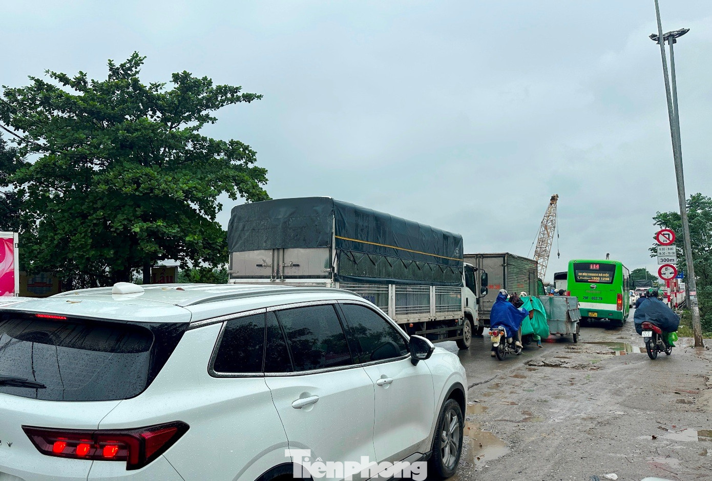 Trong sáng và trưa 18/11 cầu Mai Lĩnh bắc qua sông Đáy tắc cứng, nhiều người và xe đã phải đứng dưới mưa cả giờ để chờ được qua cầu.