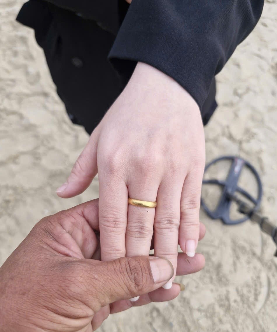 Sau khoảng 1 tiếng dùng dụng cụ dò tìm, lúc 6h sáng, anh Trinh và anh Đông đã tìm thấy chiếc nhẫn ẩn dưới lớp cát biển.