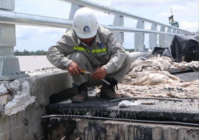 Công nhân thi công hệ thống điện cầu Đại Ngãi 2