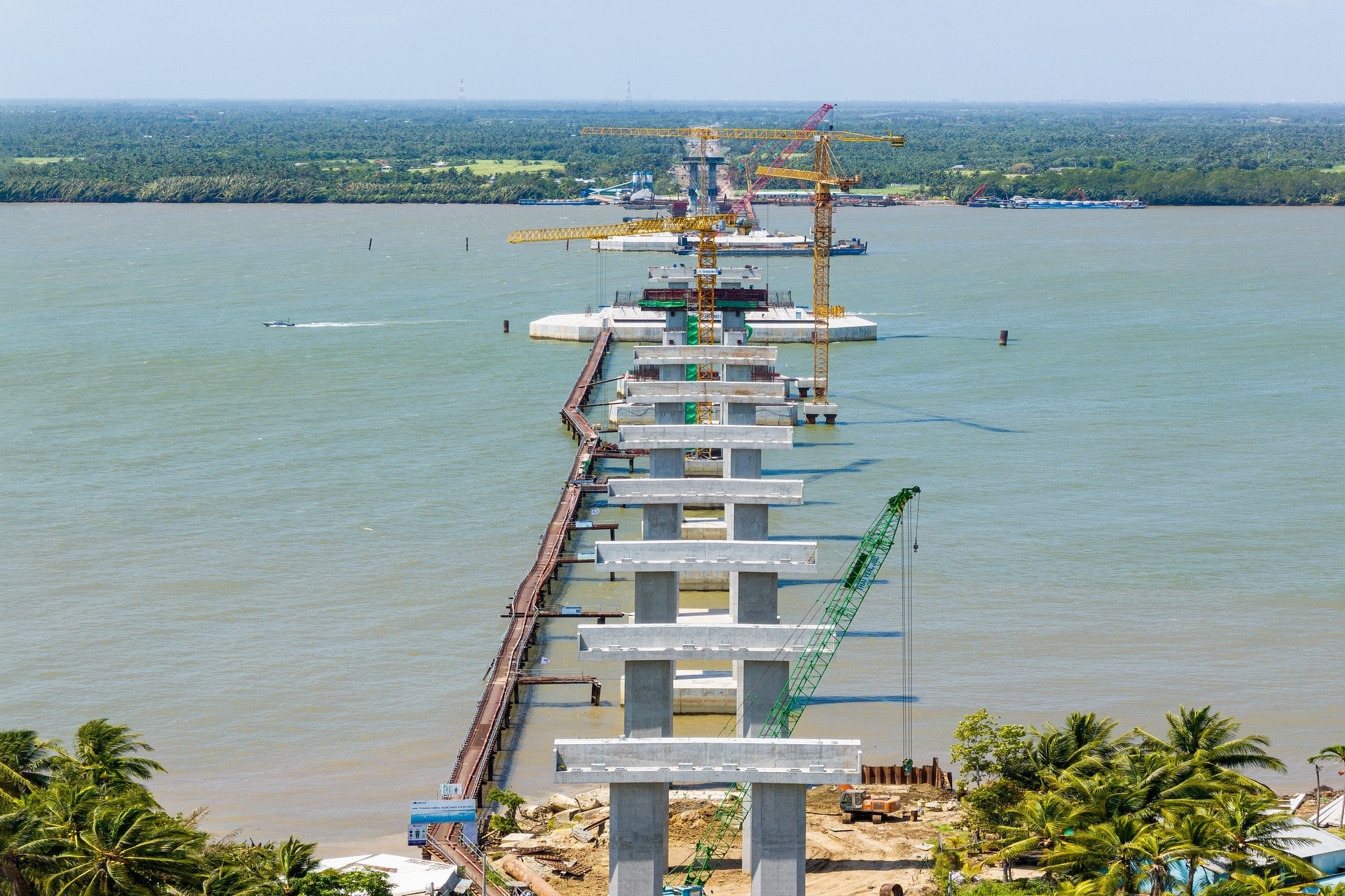 Sau hơn một năm triển khai, cầu Đại Ngãi 1 đã đạt gần 59% khối lượng thi công. Ảnh: Đèo Cả